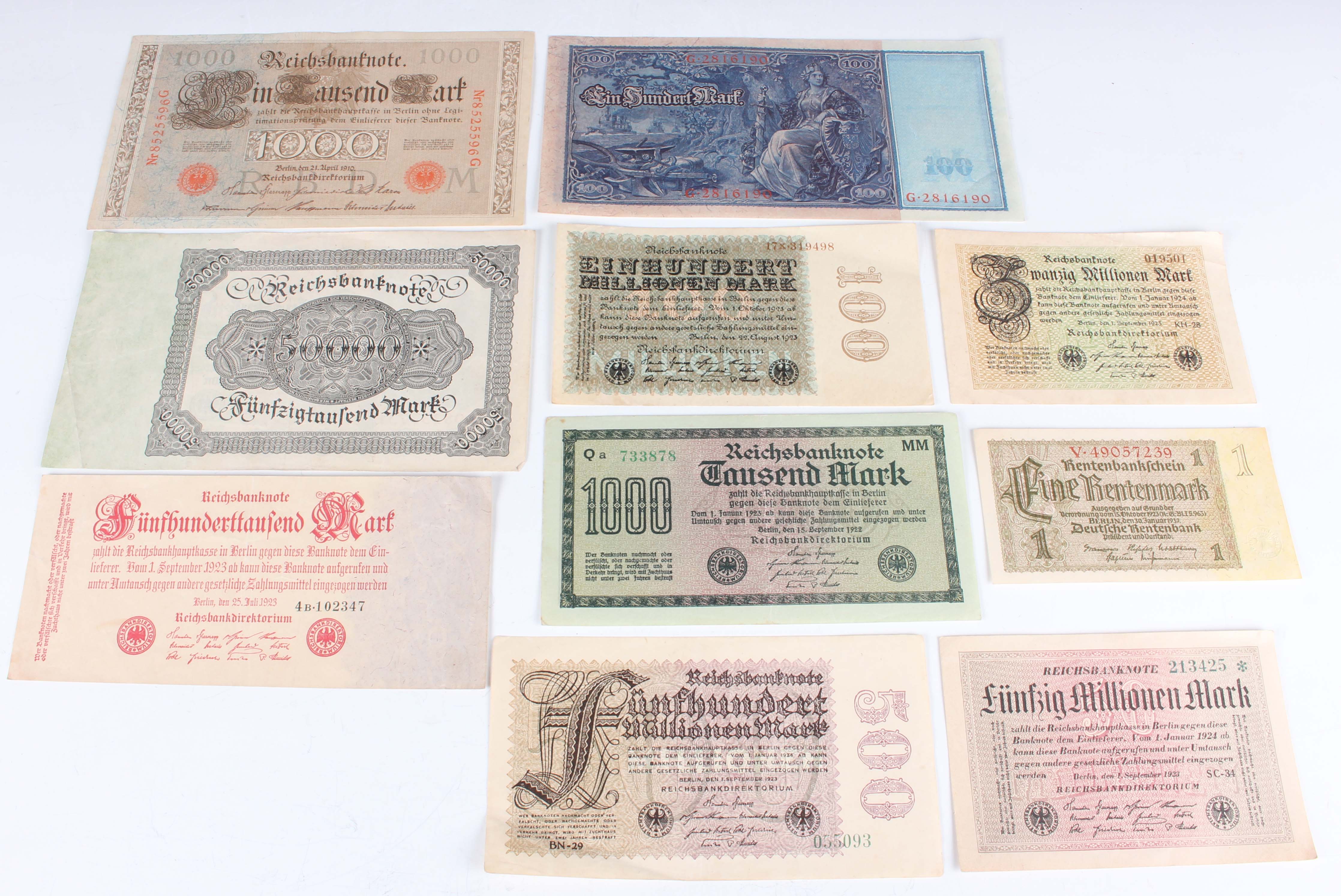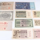 A collection of mainly German banknotes, including a group of notgeld.