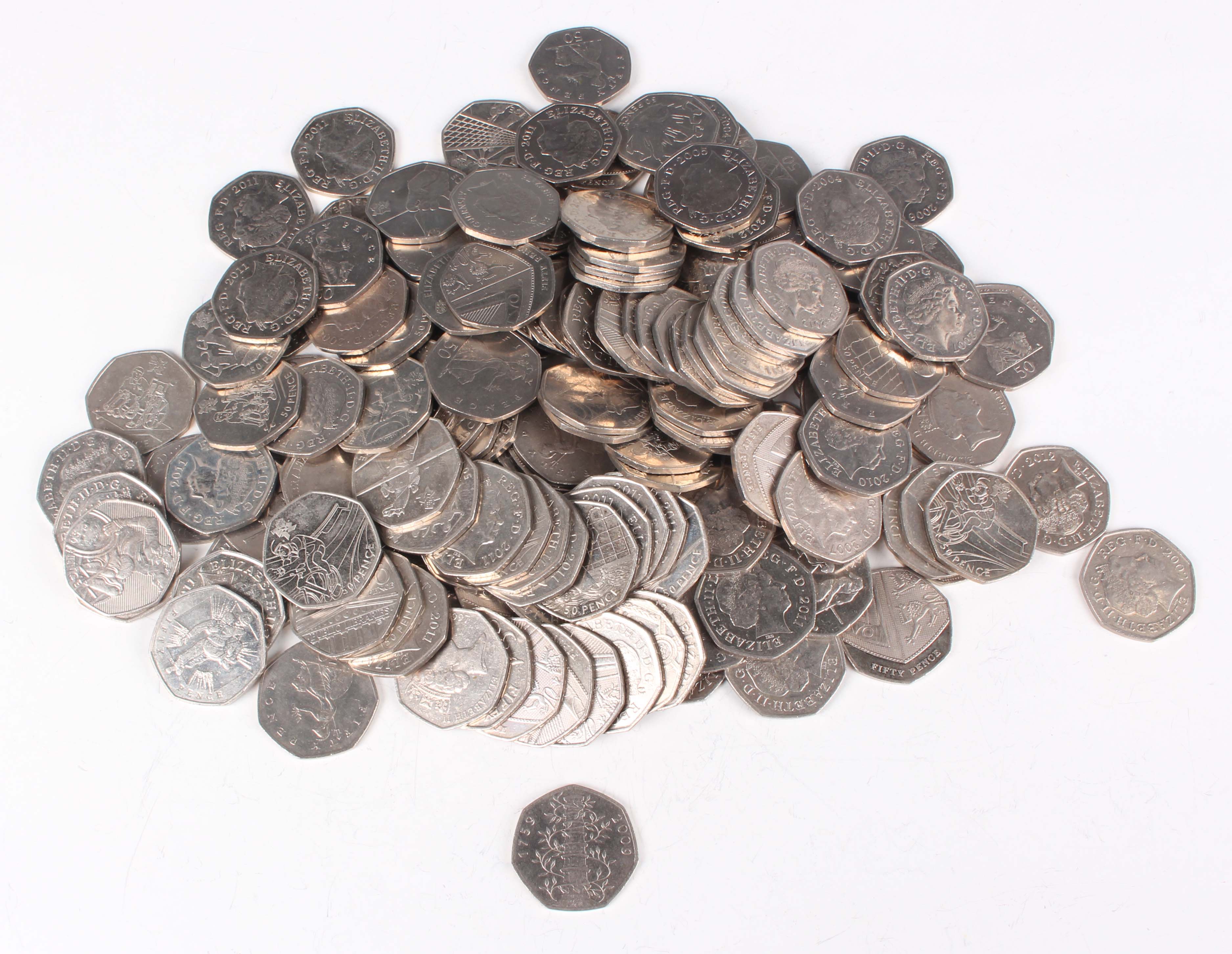 A large collection of Elizabeth II fifty pences, including a Kew Gardens 2009 example (all circulated).