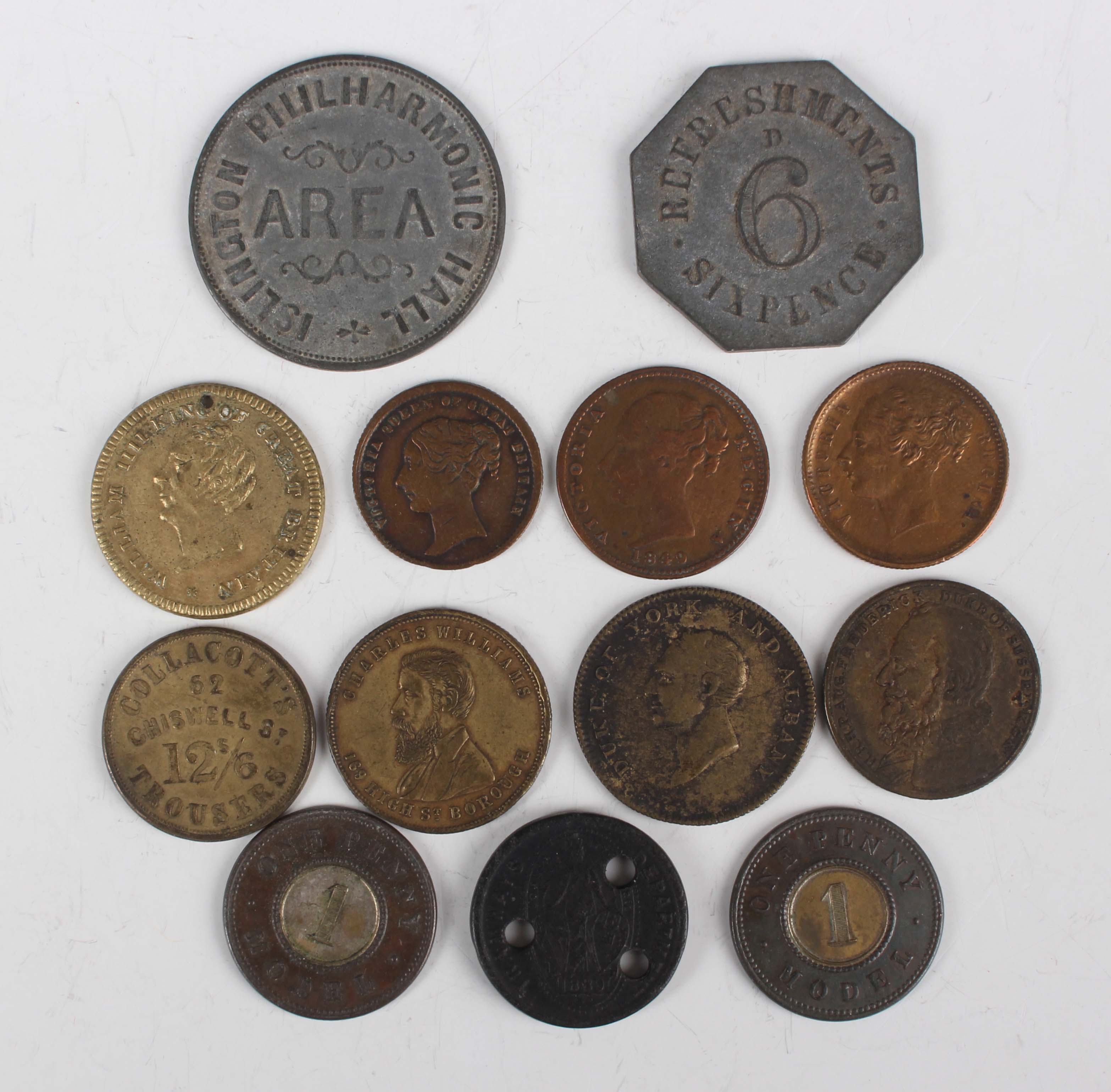A small group of late 19th century and early 20th century tokens and other paranumismatic items, including an Islington Highbury Barn Gardens sixpence refreshments token, an Islington Philharmonic Hall 'Area' ticket/token, two Victoria Model One Penny and a London County Council Tramways Department composite halfpenny token.