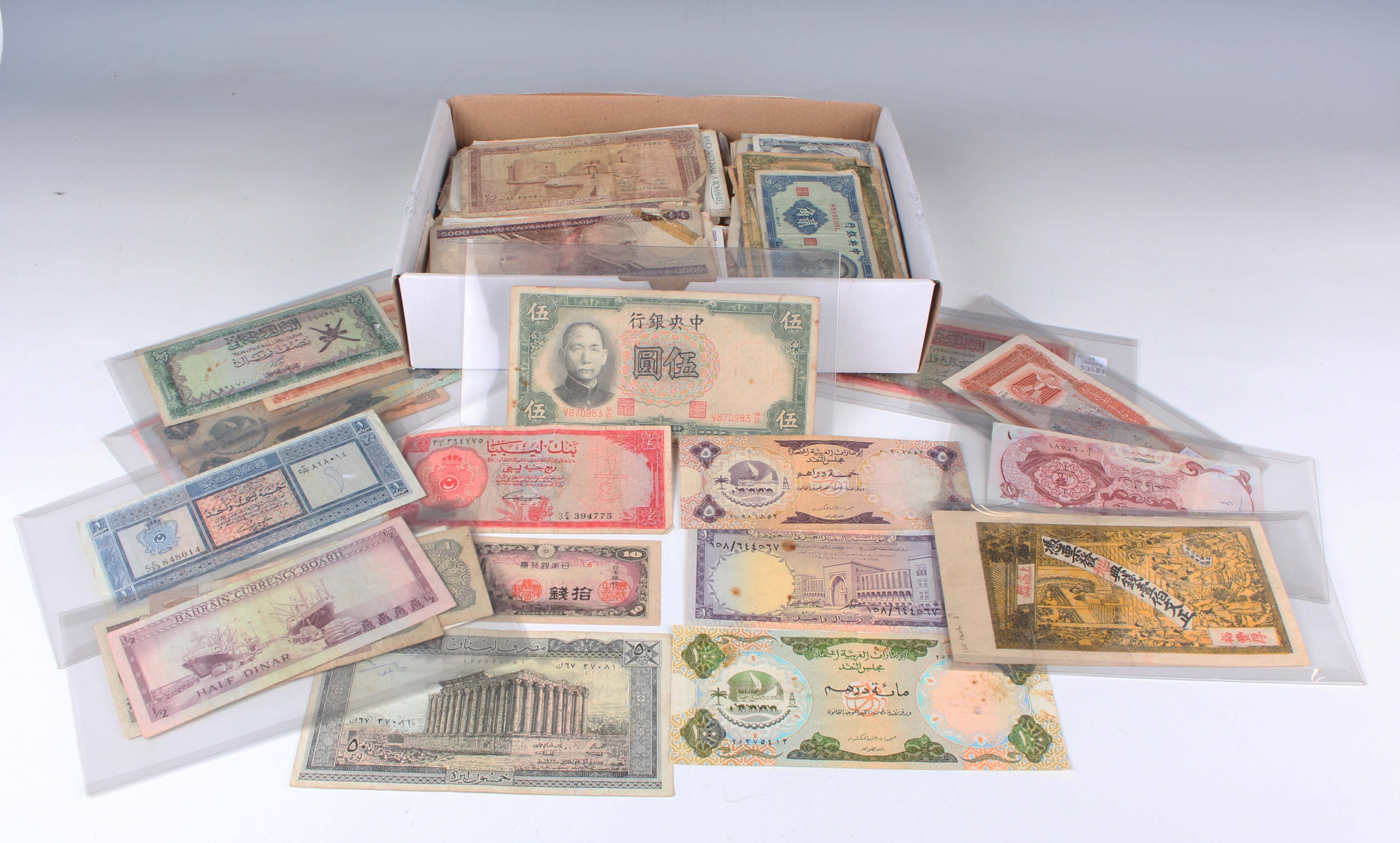 A large collection of European and world banknotes, including Middle East, China and Japan (generally circulated throughout).