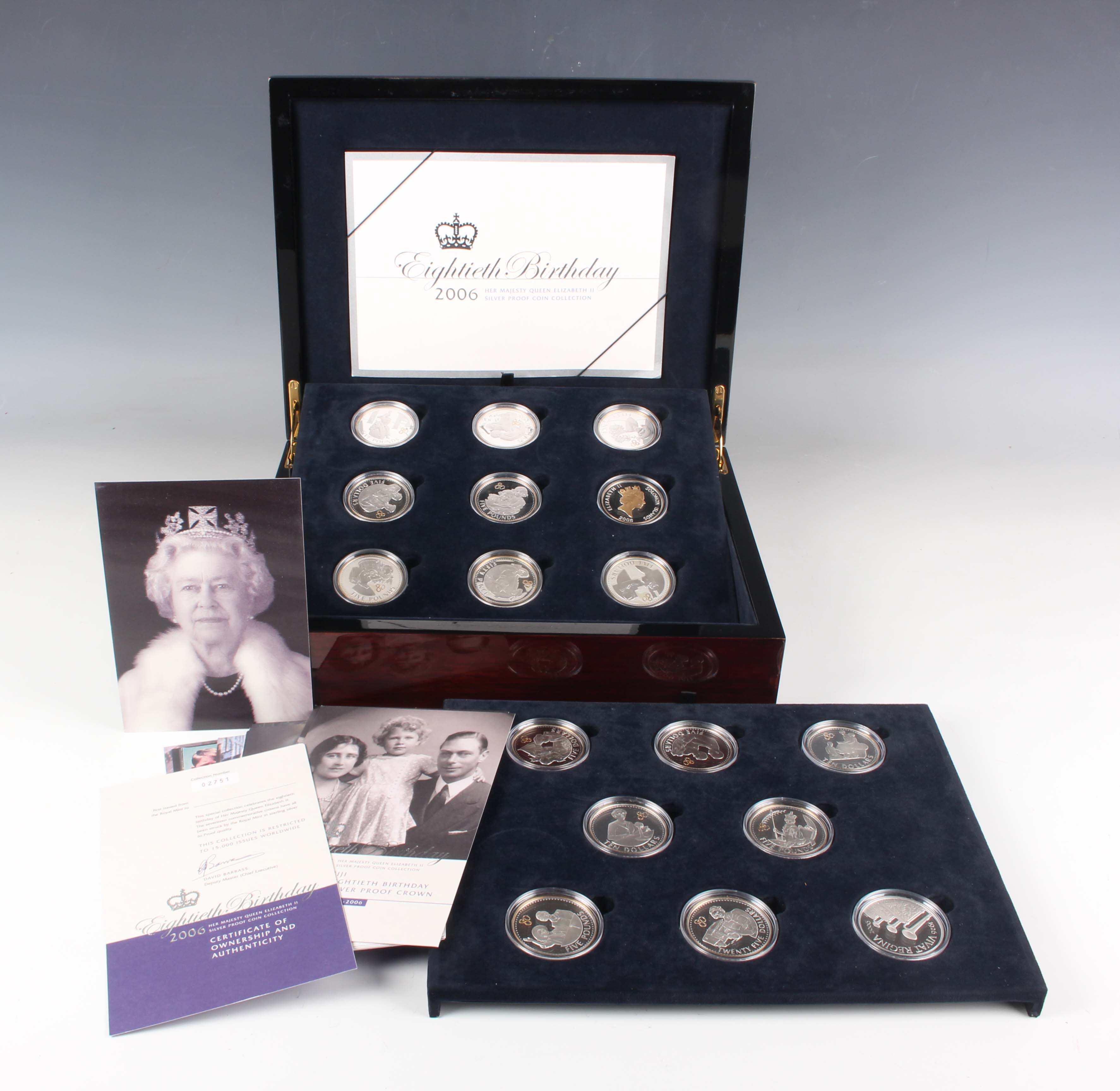 A Royal Mint Elizabeth II Eightieth Birthday silver proof and part gold plated crown-size seventeen-coin set 2006, deluxe-cased with certificates (some certificates missing).