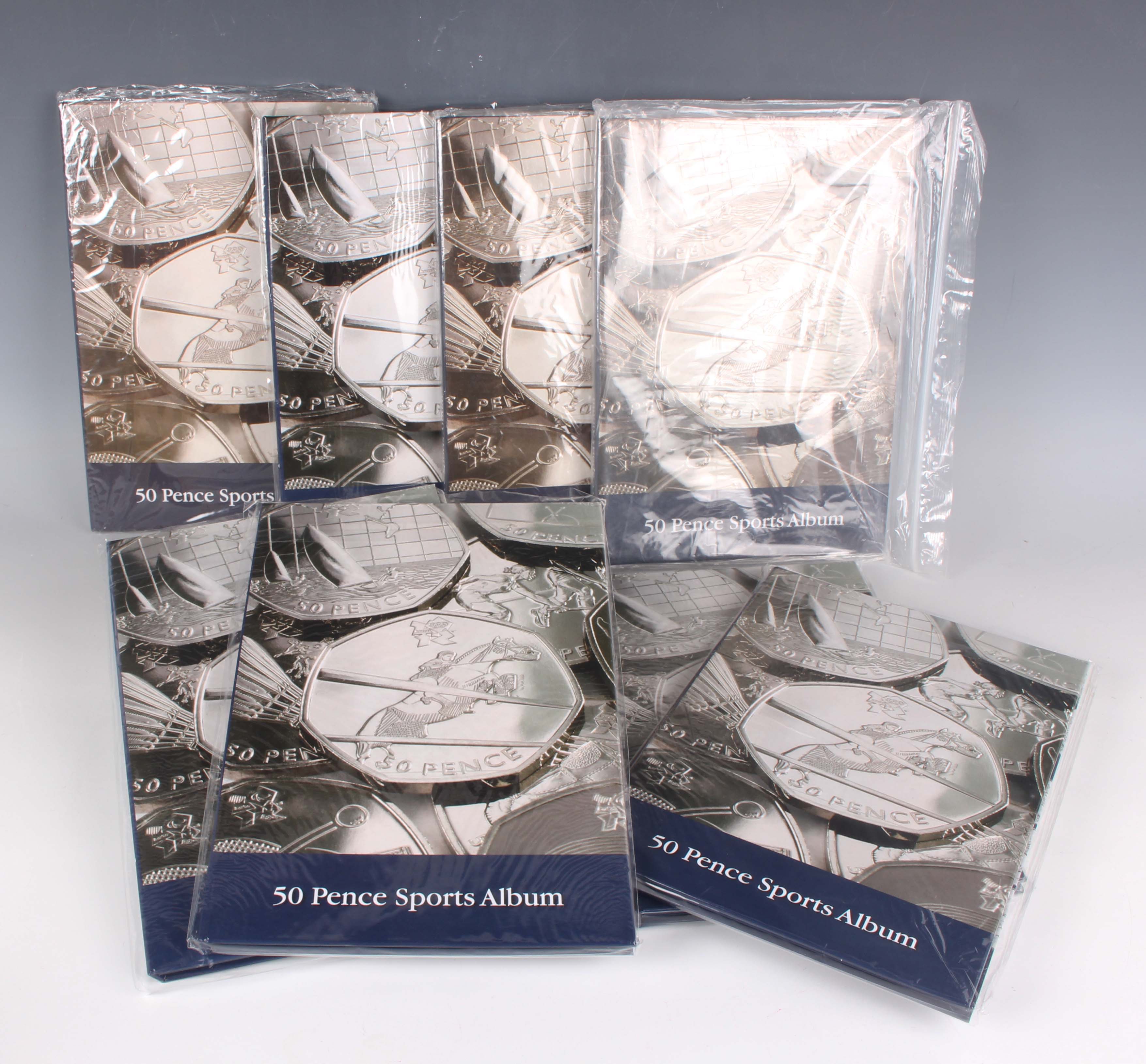 A collection of eight Lighthouse 50 Pence Sports Albums, containing complete and near-complete collections of circulated sports related designs on fifty pence coins.