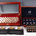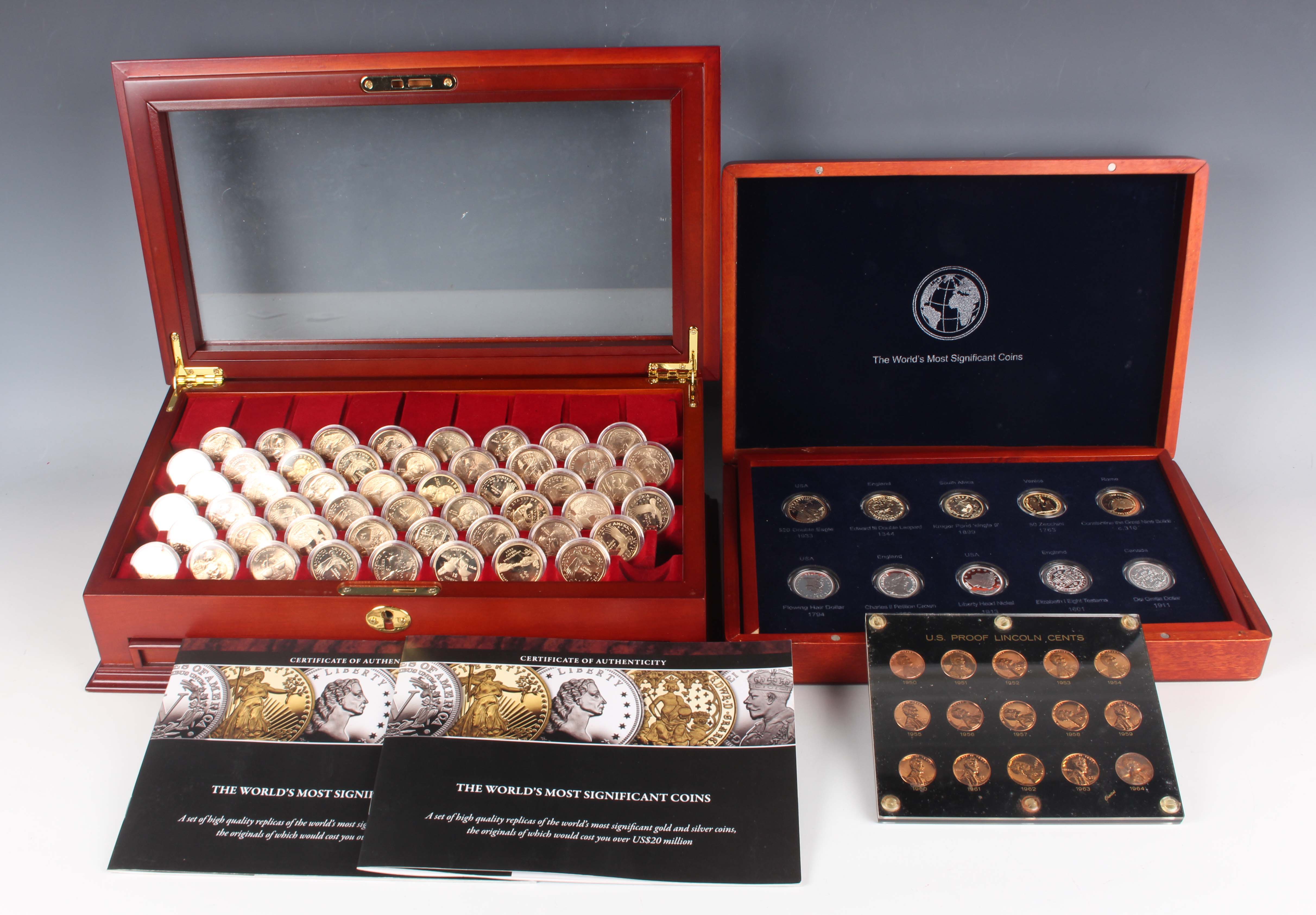 A collection of USA interest coins and commemoratives, comprising a group of fifty late 20th century dollars, displayed in capsules within a wood-effect tiered display cabinet, a London Mint Office The World's Most Significant Coins ten-coin set, deluxe-cased with certificates, and a display of fifteen USA proof Lincoln cents 1950-1964, within a clear plastic case.