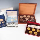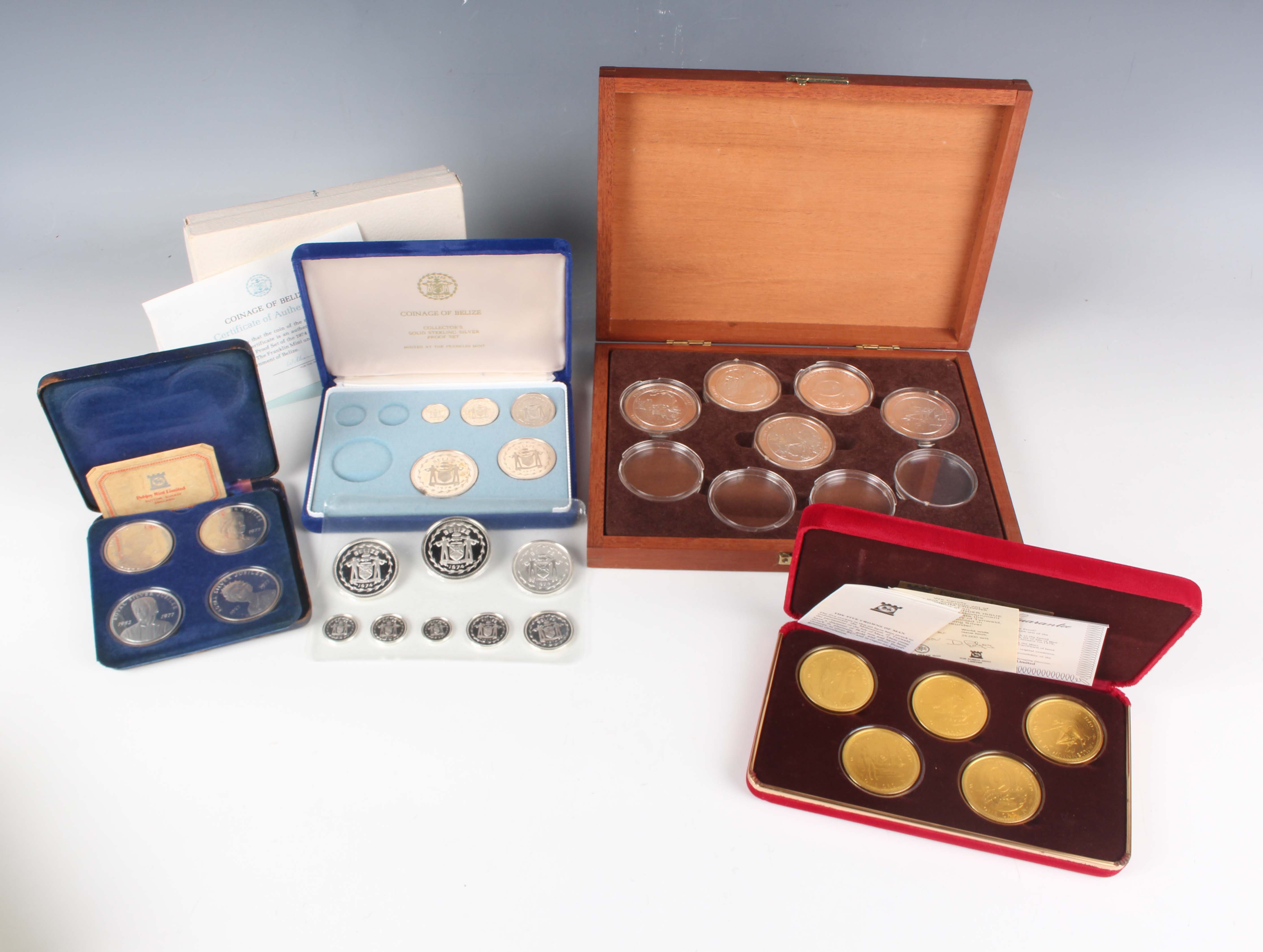 A collection of silver commemorative coinage, including a Franklin Mint Coinage of Belize silver proof eight-coin set 1974, cased with certificate, a matching five-coin part-set, a Pobjoy Mint silver four-coin set celebrating the Royal Silver Jubilee 1952-1977, cased, and a Pobjoy Mint The Five Crowns of Man silver five-coin set, cased with certificate.