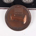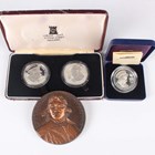A Pobjoy Mint two-coin set 1990 commemorating Sir Winston Churchill, cased (case fatigued), together with a Monnaie de Paris silver Winston Churchill commemorative coin, cased with certificate, and a copper medallion commemorating the 200th Anniversary of Napoleon's Birth 1769-1969.