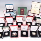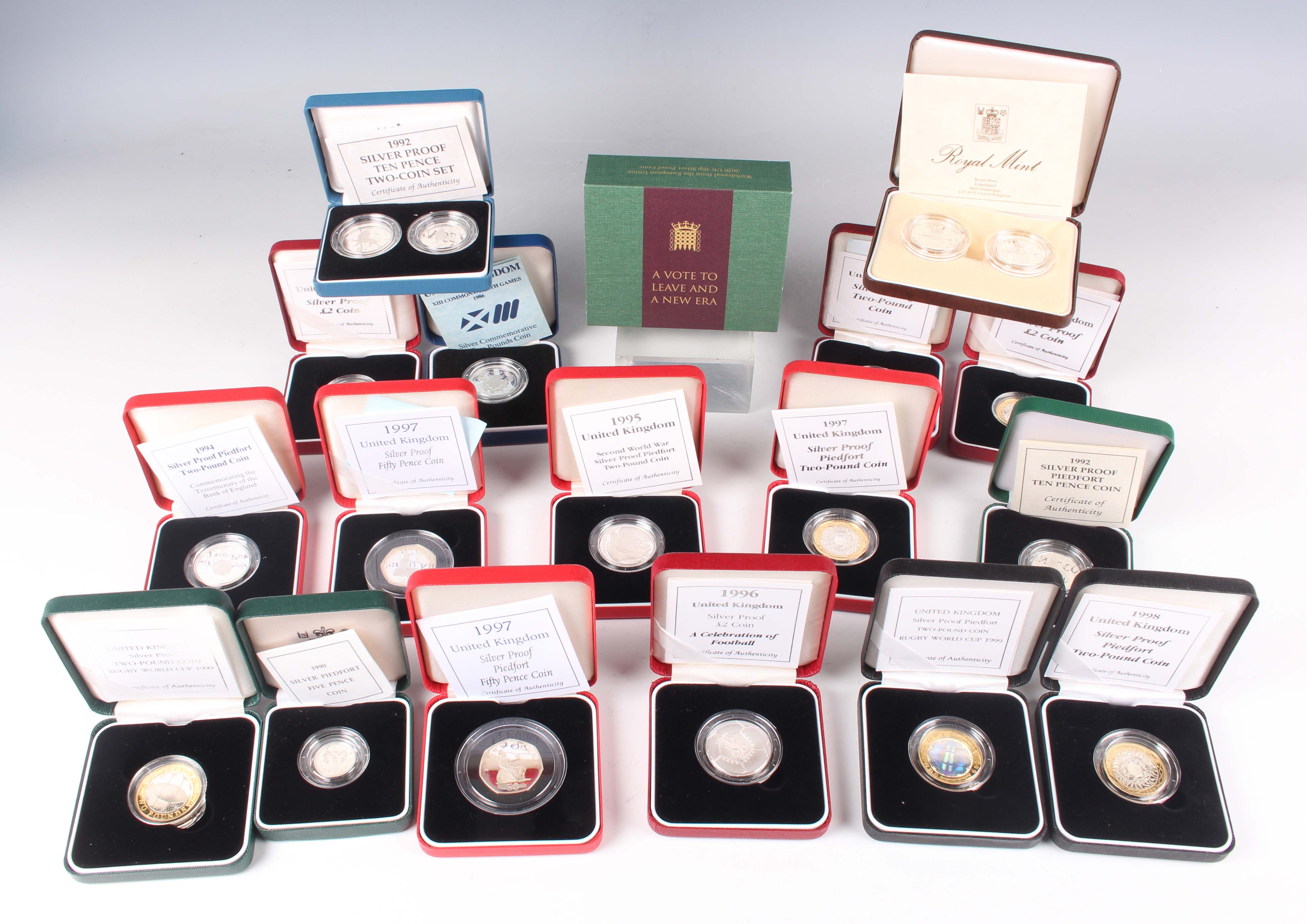 A collection of Elizabeth II Royal Mint silver proof coins, including a piedfort fifty pence 1997, a piedfort five pence 1990, a ten pence 1992 and a Withdrawal from the European Union fifty pence 2020, all deluxe-cased with certificates.