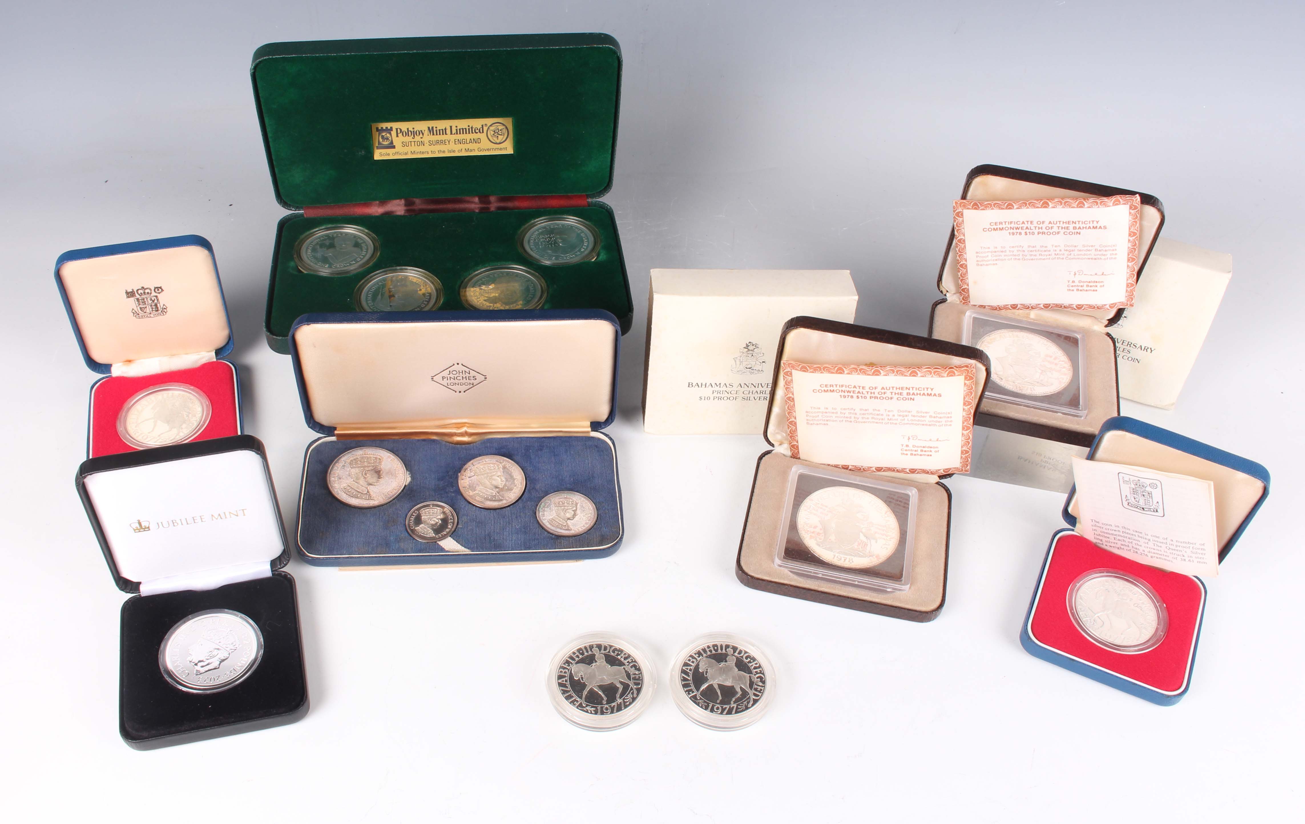 A small group of Royal Mint and other silver proof coinage, including three Silver Jubilee crowns 1977, one cased, a Pobjoy Mint Isle of Man crown four-coin set 1981 commemorating the International Year of the Disabled, and two Prince Charles Bahamas’ Fifth Anniversary of Independence silver proof ten dollars 1978, the majority cased.