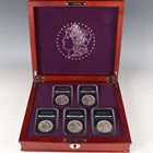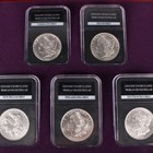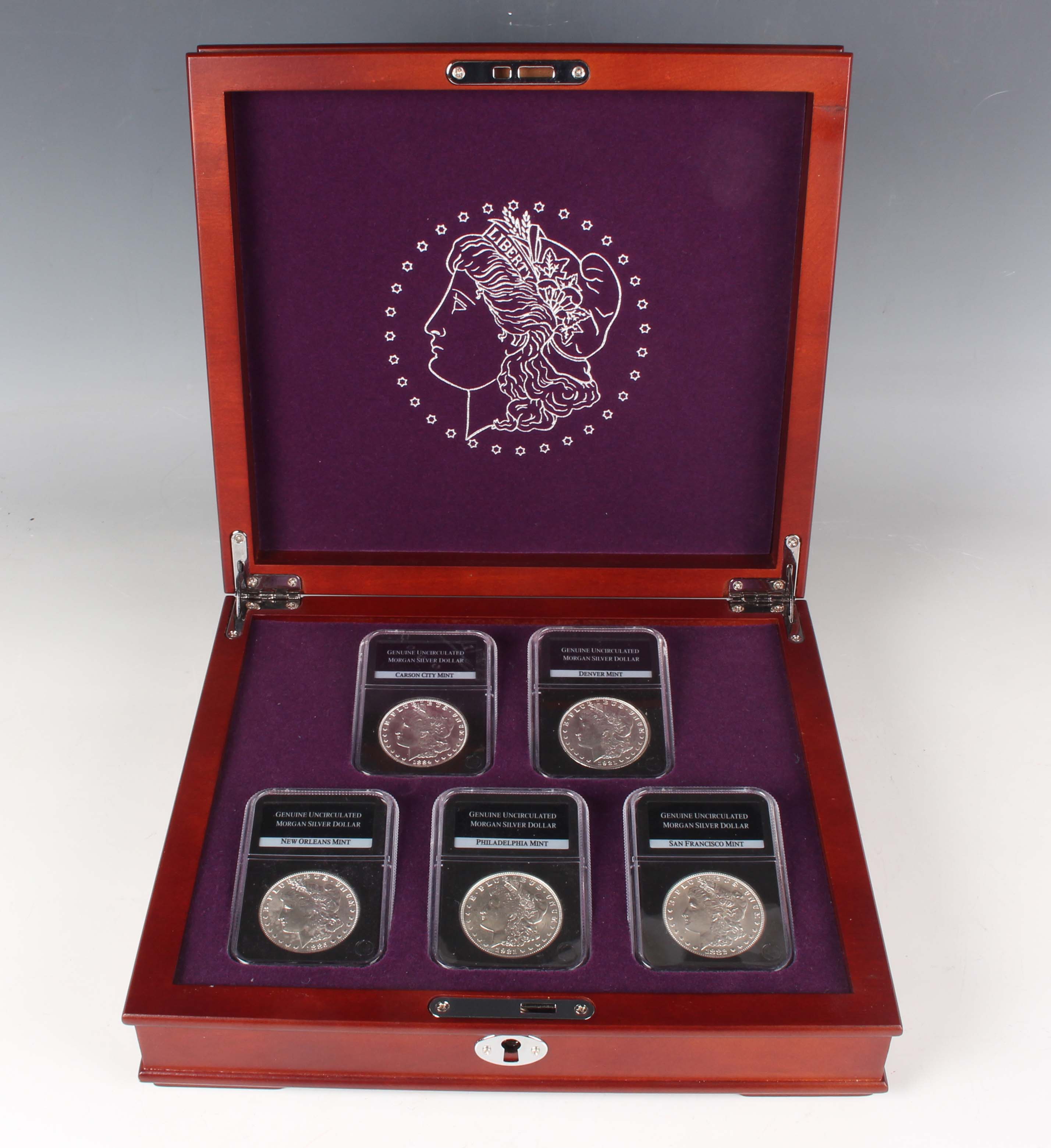 An Uncirculated US Morgan Silver Dollar Mint Collection five-coin set, comprising 1882 San Francisco Mint, 1884 Carson City Mint, 1885 New Orleans Mint, 1921 Denver Mint and 1921 Philadelphia Mint, each slabbed by PCS Stamps & Coins, within a wood-effect case.