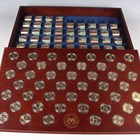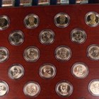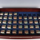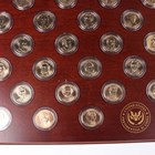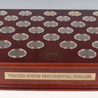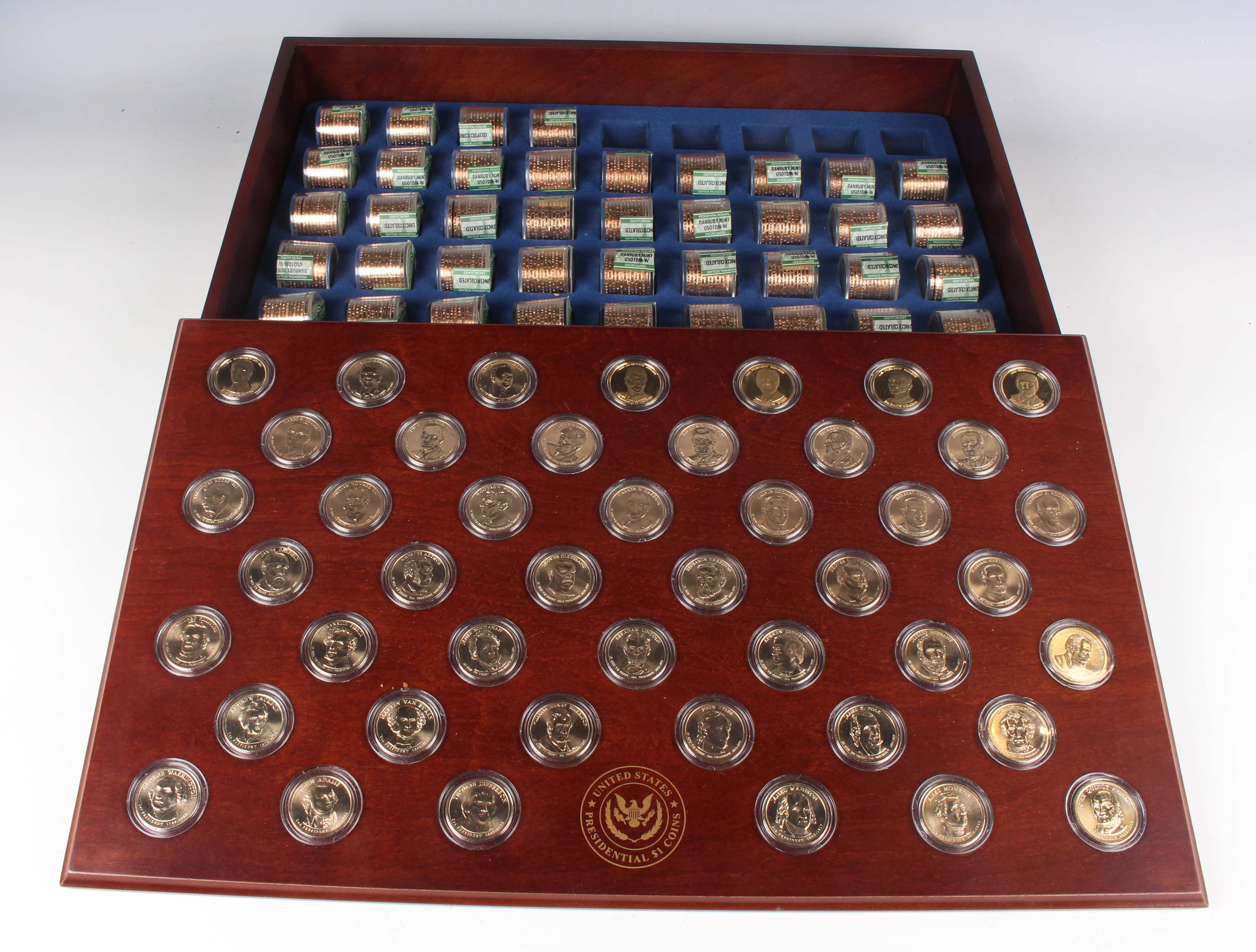 A Danbury Mint United States Presidential Dollars Collection part-set, comprising forty-five dollars and private issue replacement medallions celebrating US presidents, displayed in capsules on a wood-effect lid, the box containing forty matching sealed rolls of twelve uncirculated dollars within the fitted interior (five rolls missing).