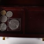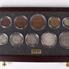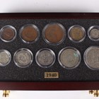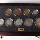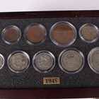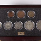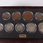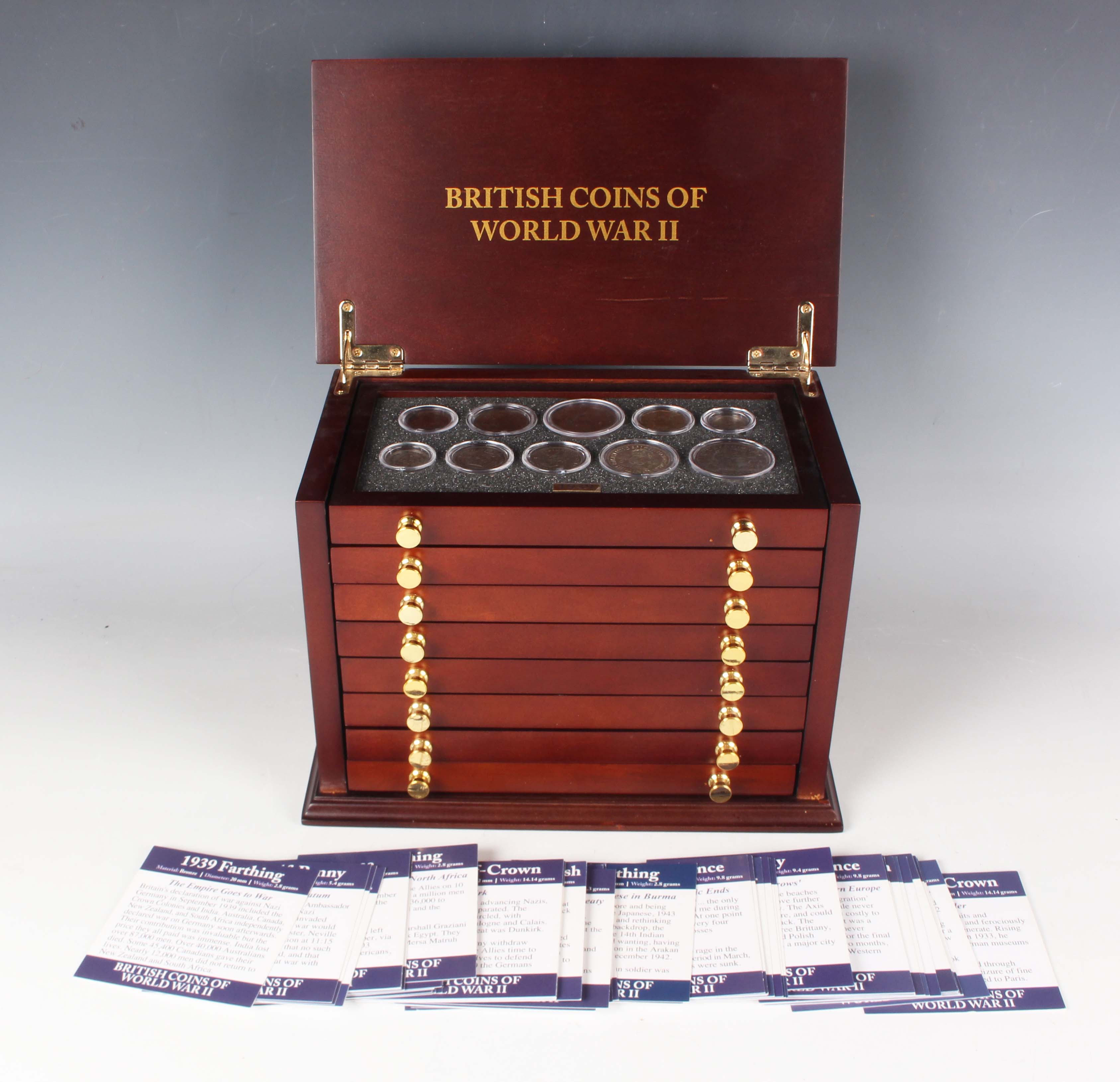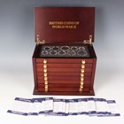 A Danbury Mint British Coins of World War II year-type commemorative coin collection, comprising seven trays containing a variety of coins, comprising half-crowns, florins, shillings, sixpences, silver threepences, brass threepences, pennies, halfpennies and farthings, within a wood-effect eight-drawer chest with associated paperwork.