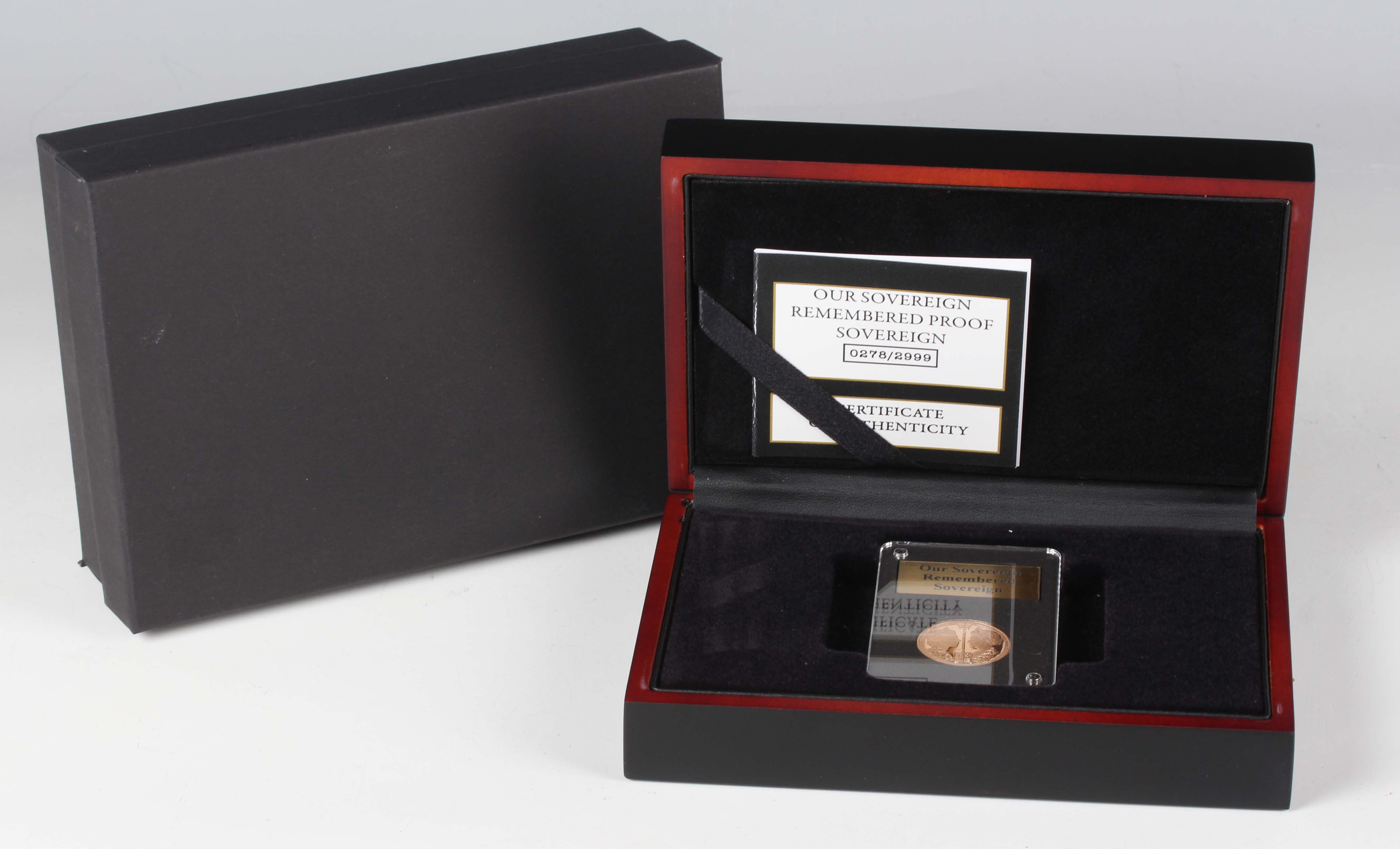 An Elizabeth II London Mint Office Our Sovereign Remembered proof sovereign 2022, deluxe-cased with certificate, No. 0278/2999. Note: this lot includes an HMRC?classified investment gold coin and is sold under standard VAT (not margin scheme). The hammer price is VAT?exempt. VAT is charged only on the Buyer’s Premium, which is shown separately, and may be recoverable depending on the buyer’s VAT status.