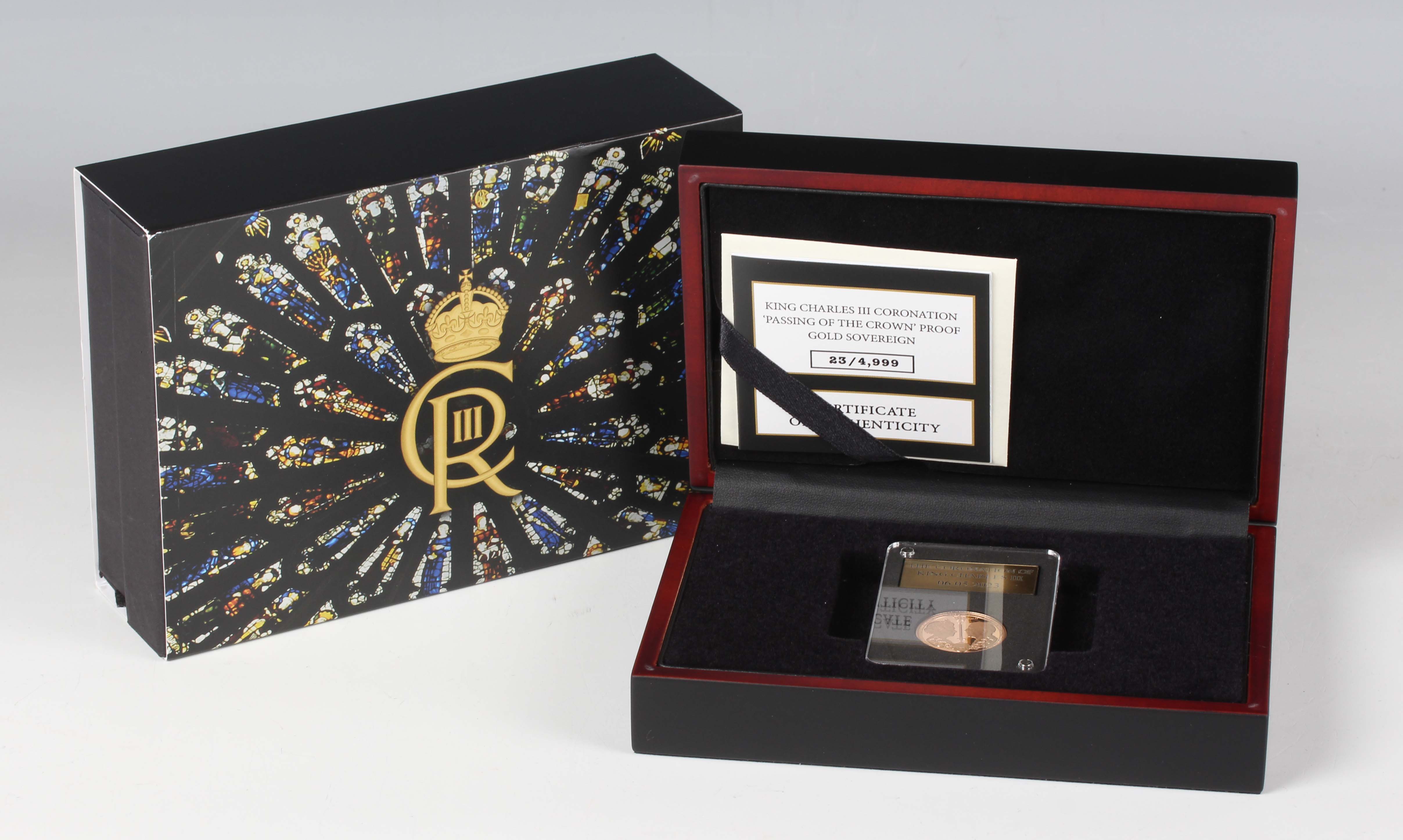 A Charles III London Mint Office The Passing of the Crown proof sovereign 2023, deluxe-cased with certificate, No. 23/4999. Note: this lot includes an HMRC?classified investment gold coin and is sold under standard VAT (not margin scheme). The hammer price is VAT?exempt. VAT is charged only on the Buyer’s Premium, which is shown separately, and may be recoverable depending on the buyer’s VAT status.