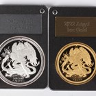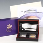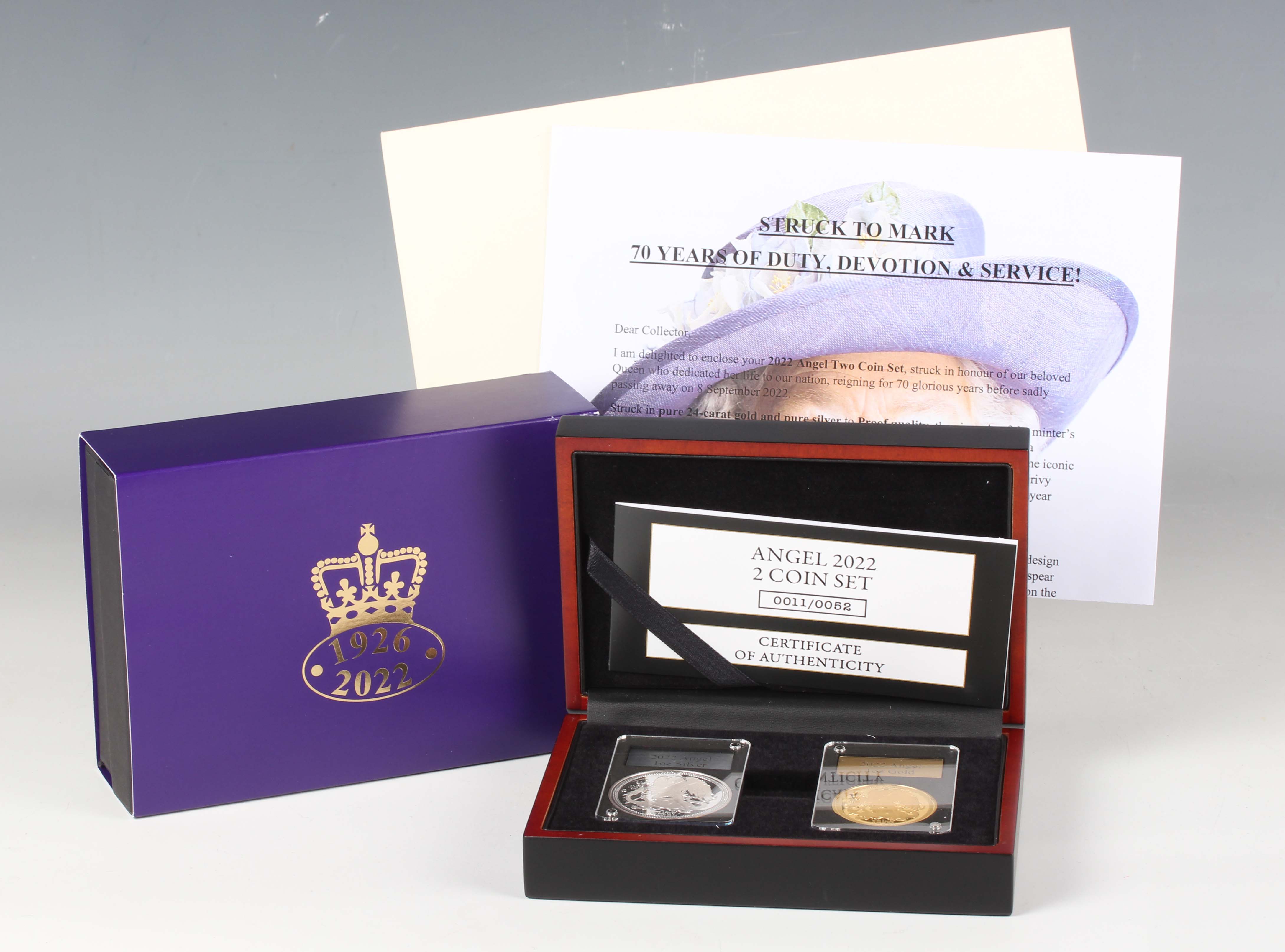 An Elizabeth II London Mint Office one-ounce gold and silver proof angel two-coin set 2022, deluxe-cased with certificate, No. 0011/0052. Note: this lot includes an HMRC?classified investment gold coin and is sold under standard VAT (not margin scheme). The hammer price is VAT?exempt. VAT is charged only on the Buyer’s Premium, which is shown separately, and may be recoverable depending on the buyer’s VAT status.