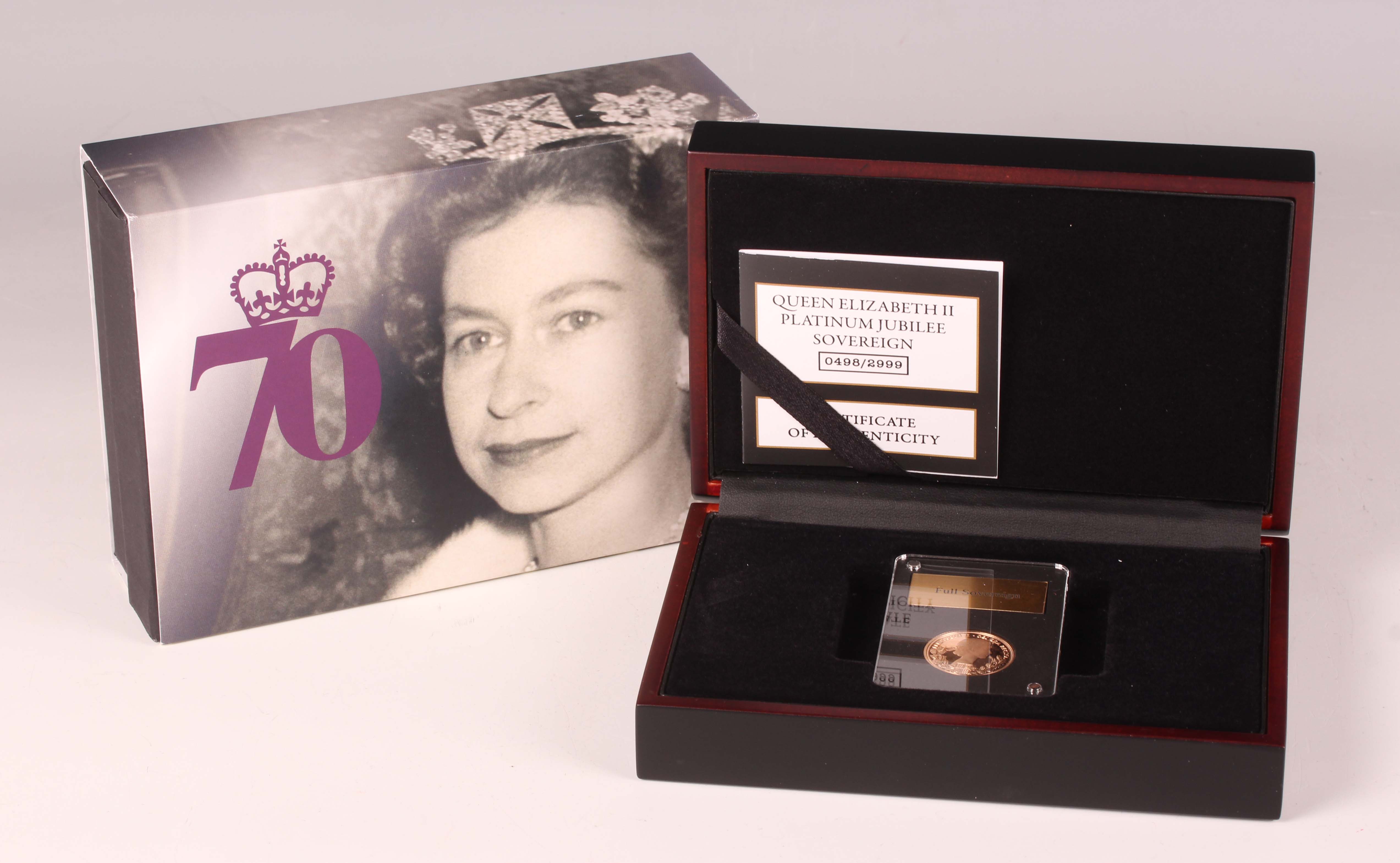 An Elizabeth II London Mint Office Queen Elizabeth II Platinum Jubilee sovereign 2022, deluxe-cased with certificate, No. 0498/2999. Note: this lot includes an HMRC?classified investment gold coin and is sold under standard VAT (not margin scheme). The hammer price is VAT?exempt. VAT is charged only on the Buyer’s Premium, which is shown separately, and may be recoverable depending on the buyer’s VAT status.