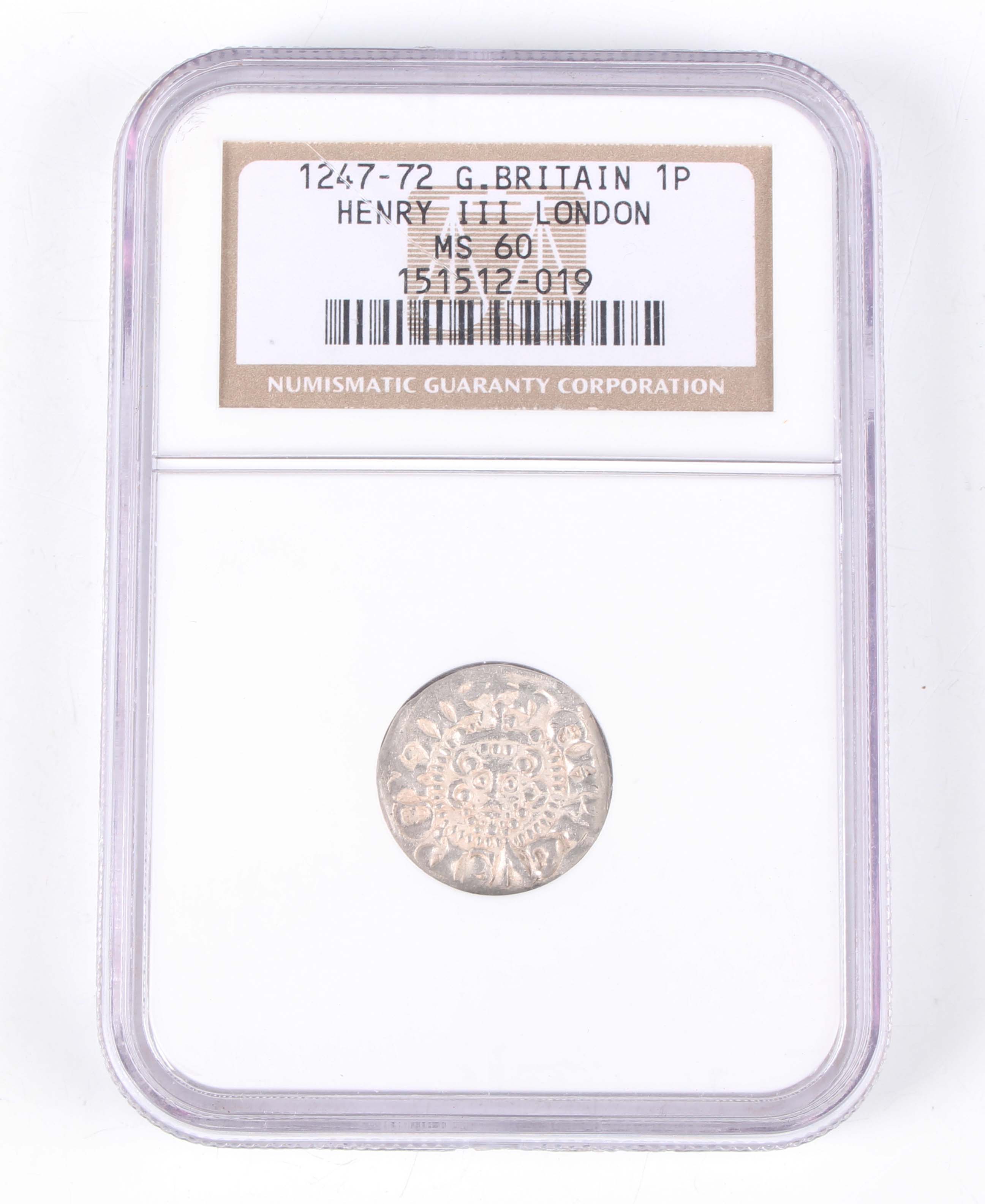 A Henry III hammered silver penny 1247-1272, long-cross coinage, moneyer 'Henri on Lunde', London Mint, Sp 1363, slabbed by Numismatic Guaranty Corporation and graded MS60 (bright silver, probably a hoard coin).