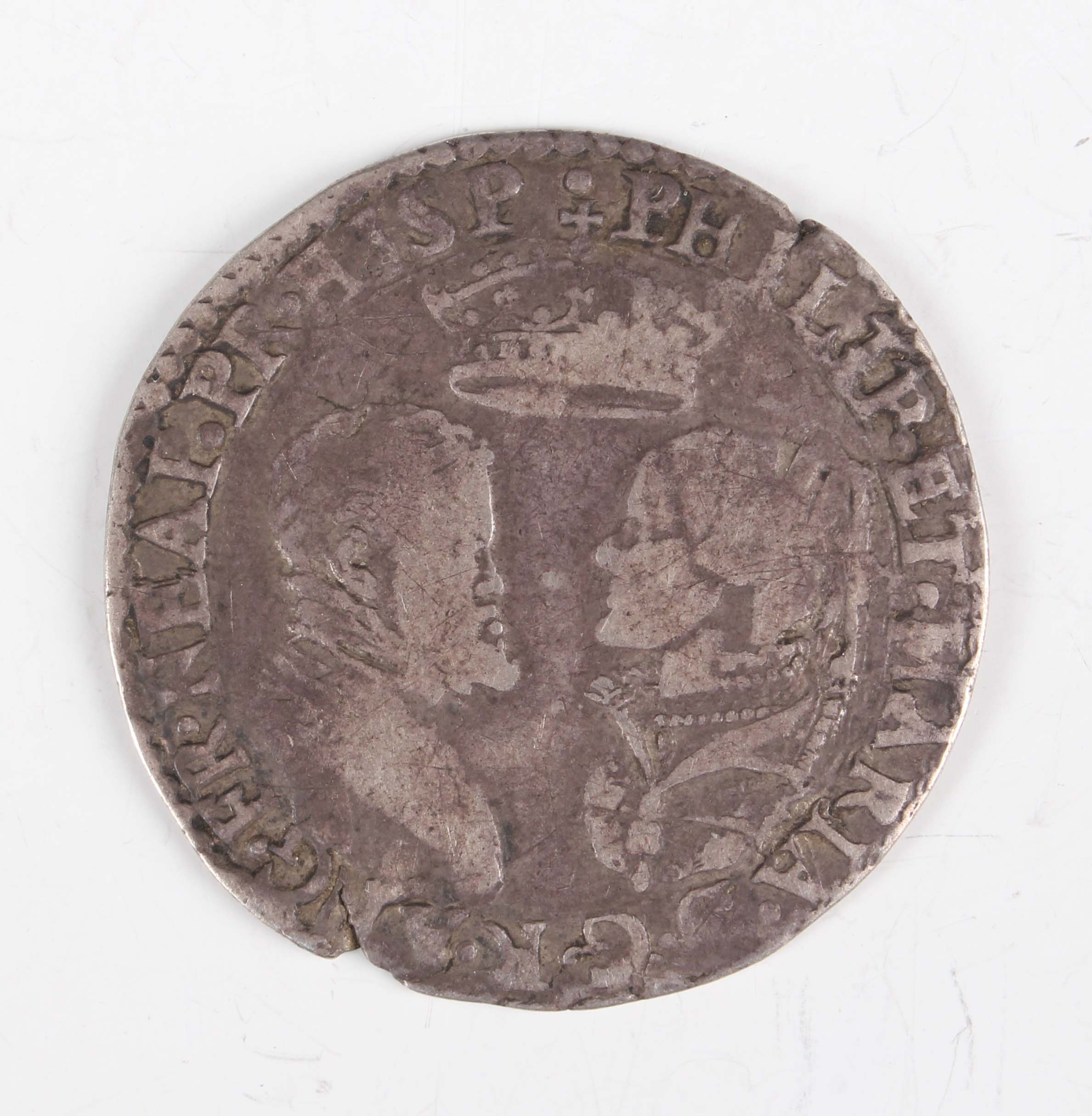 A scarce Philip and Mary hammered silver shilling 1554-1558, undated type, obverse with facing busts, Sp 2501A (good-fine, toned, nicely defined busts, some unevenness to flan).