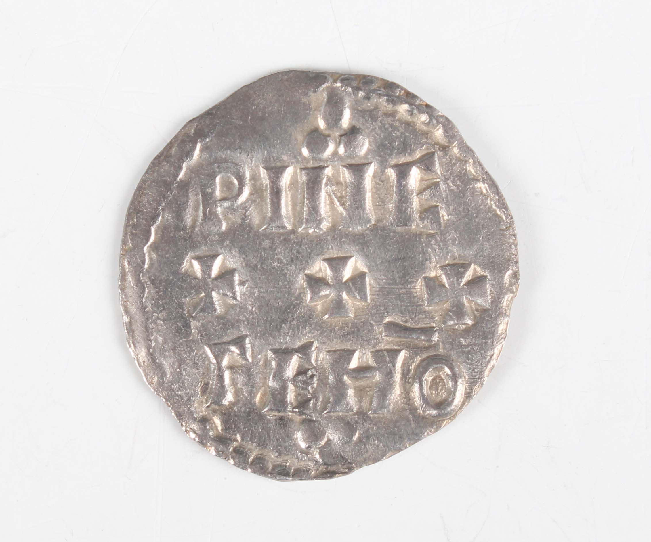 An Aethelstan hammered silver penny 924-939, two-line type, obverse with 'Aedelstan Rex' around small cross, reverse with moneyer 'Pine Ye Ho' in two lines divided by three small crosses, pellets above and below, Sp 1089 (good-very fine, some die-clash, bright silver, a scarce moneyer).