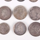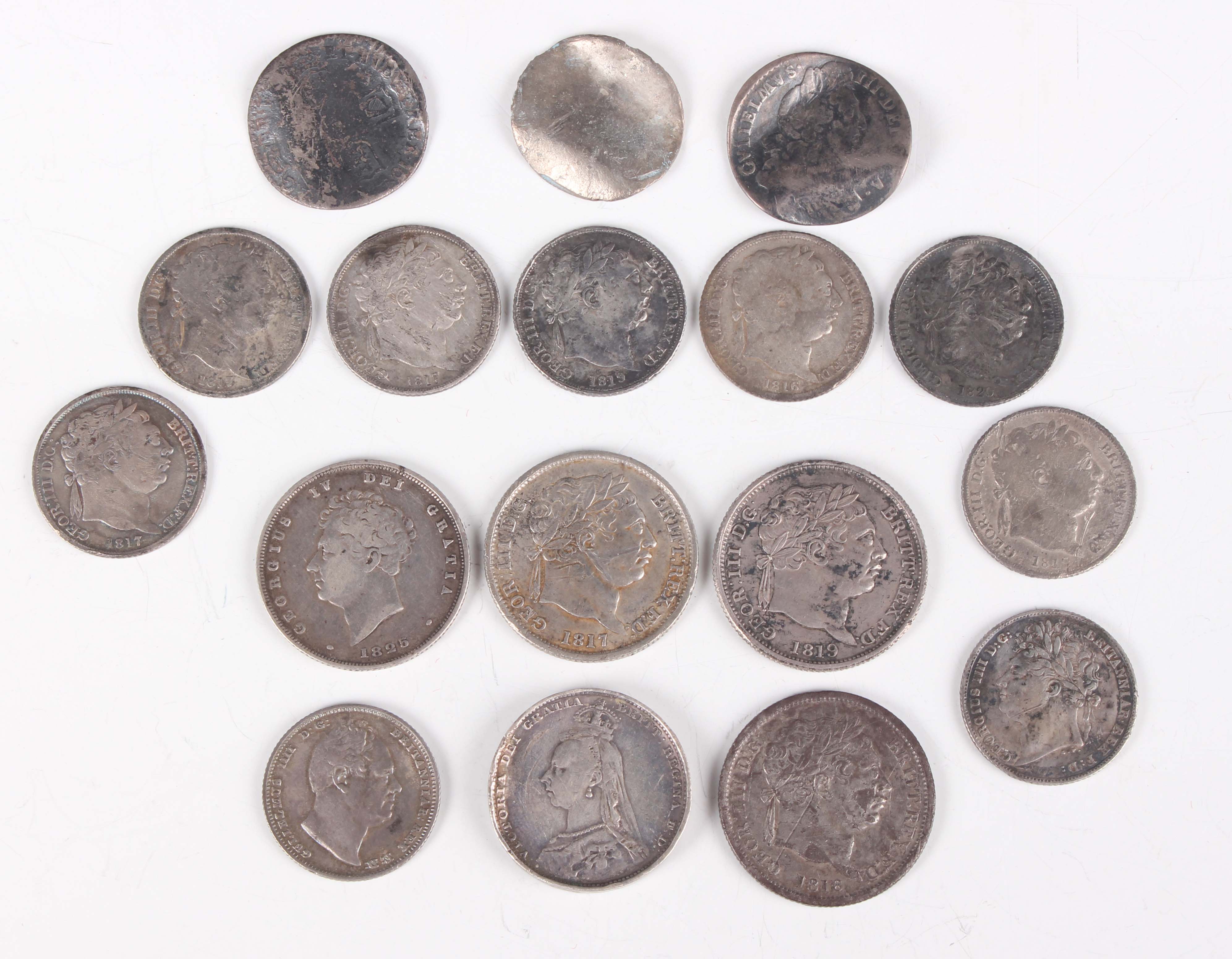 A collection of late 17th, 18th and early 19th century milled silver coinage, including a George III Bull Head shilling 1819, a George IV shilling1825 and a William IV sixpence 1834.