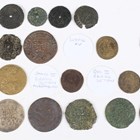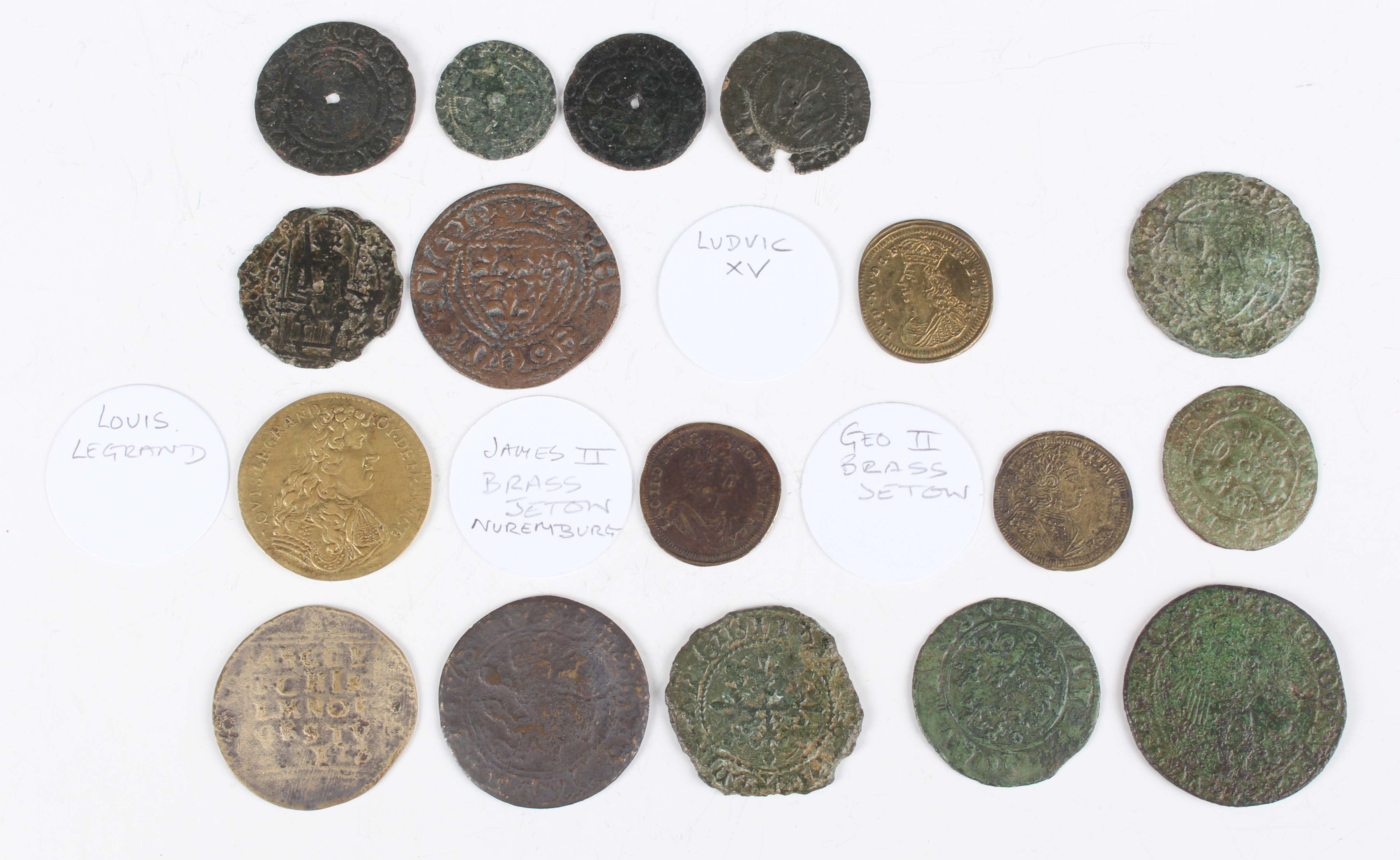 A collection of 14th-17th century European copper-alloy jettons, including an Edward I type, obverse with Edward standing under canopy, a group of four Edward I cross-pellets and symbols types, one with portrait bust of Edward, a France fleur-de-lis in shield type and a German States brass counter depicting Louis XIV.