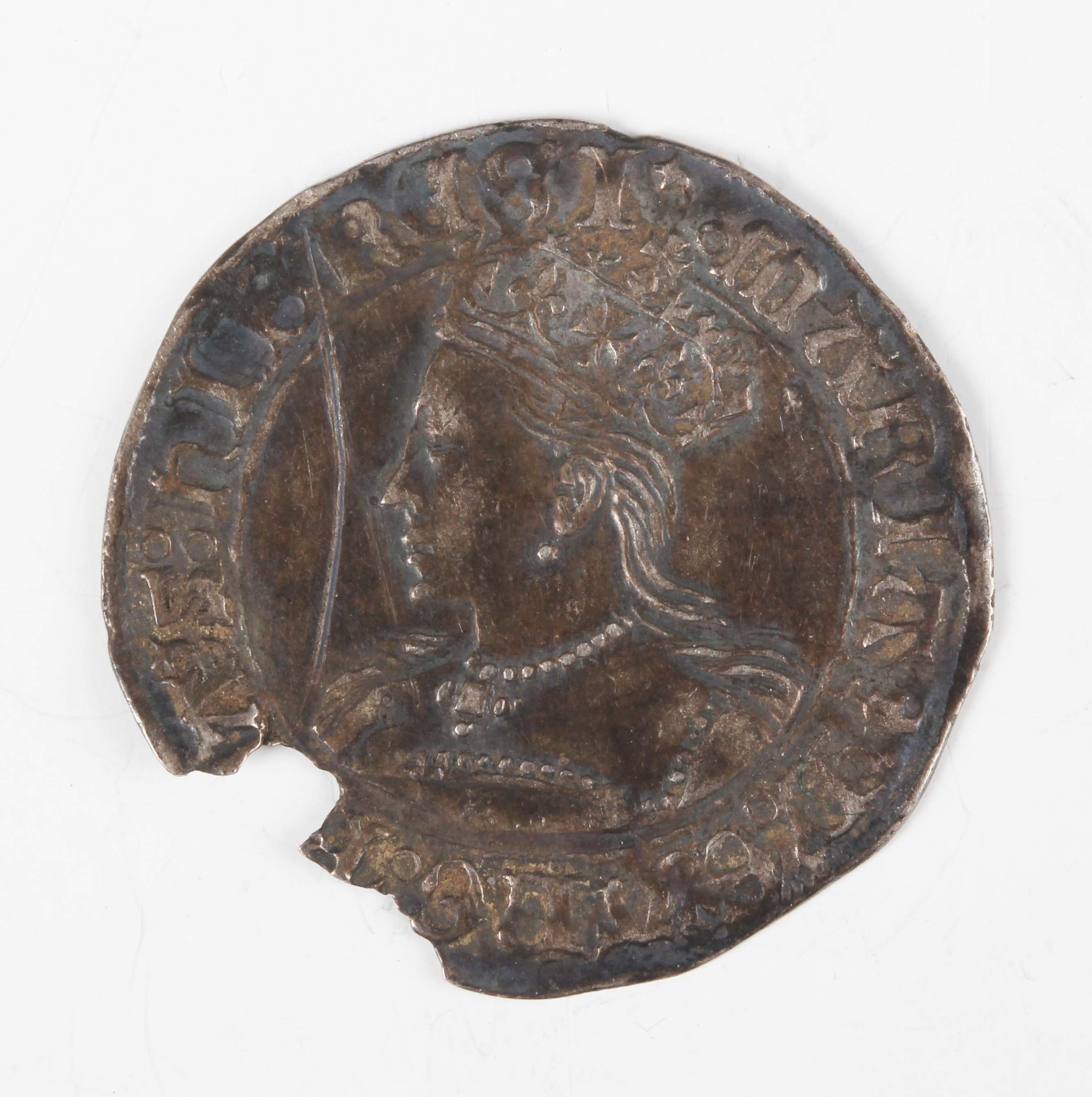 A Mary hammered silver groat 1553-1554, mintmark pomegranate, Sp 2492 (a sharp specimen with good tone, but some loss to flan and scratch to field in front of face).