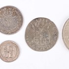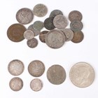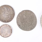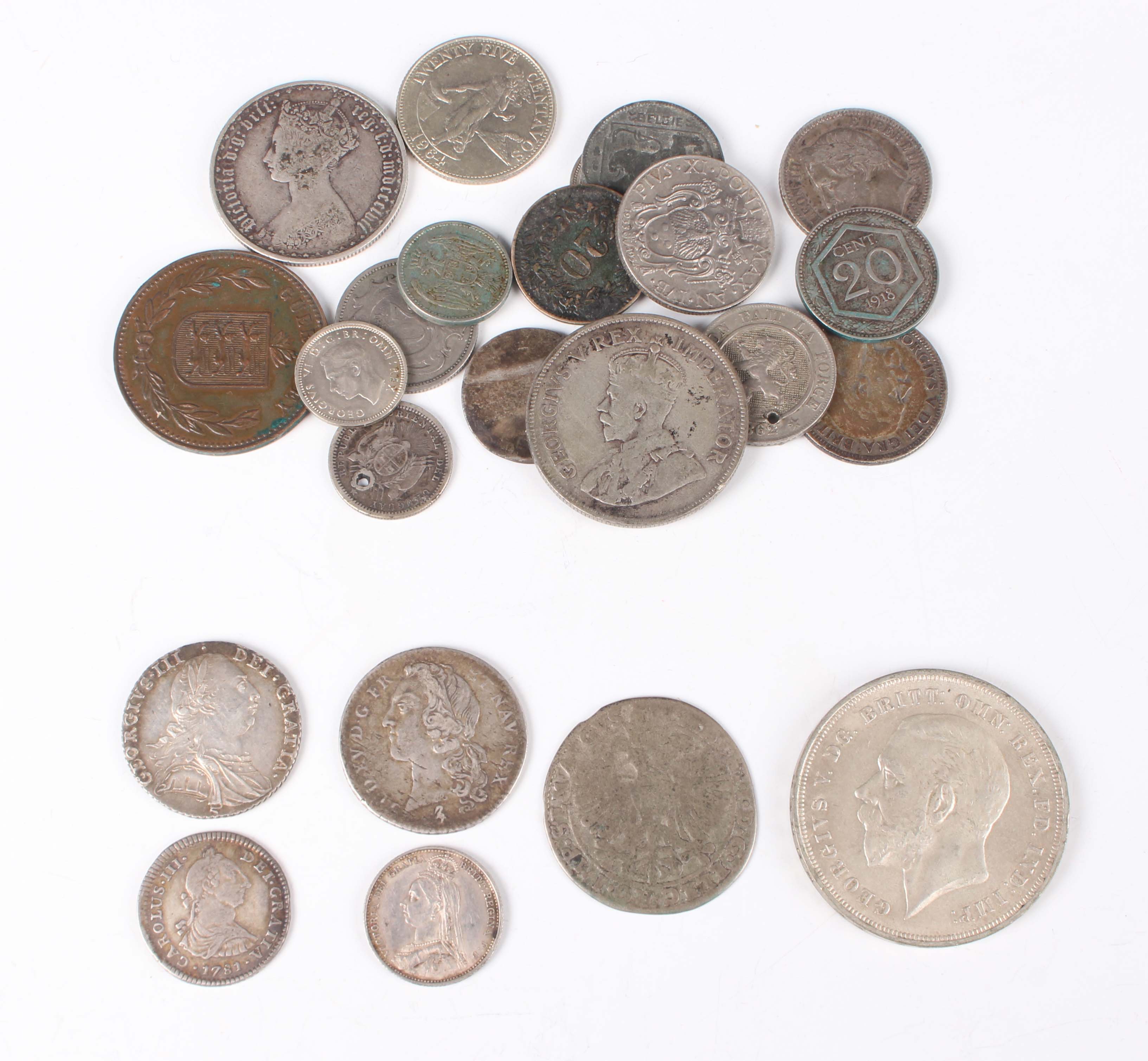 A small collection of European and world coinage, including a George III shilling 1787 with semée of hearts, Sp 3746 (extremely fine, toned), a Spain Charles III one real 1781, a France Louis XV one-fifth ecu 1759 and a Dutch Republic Matthias six stuivers 1611-1619.