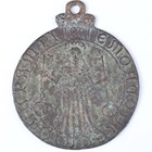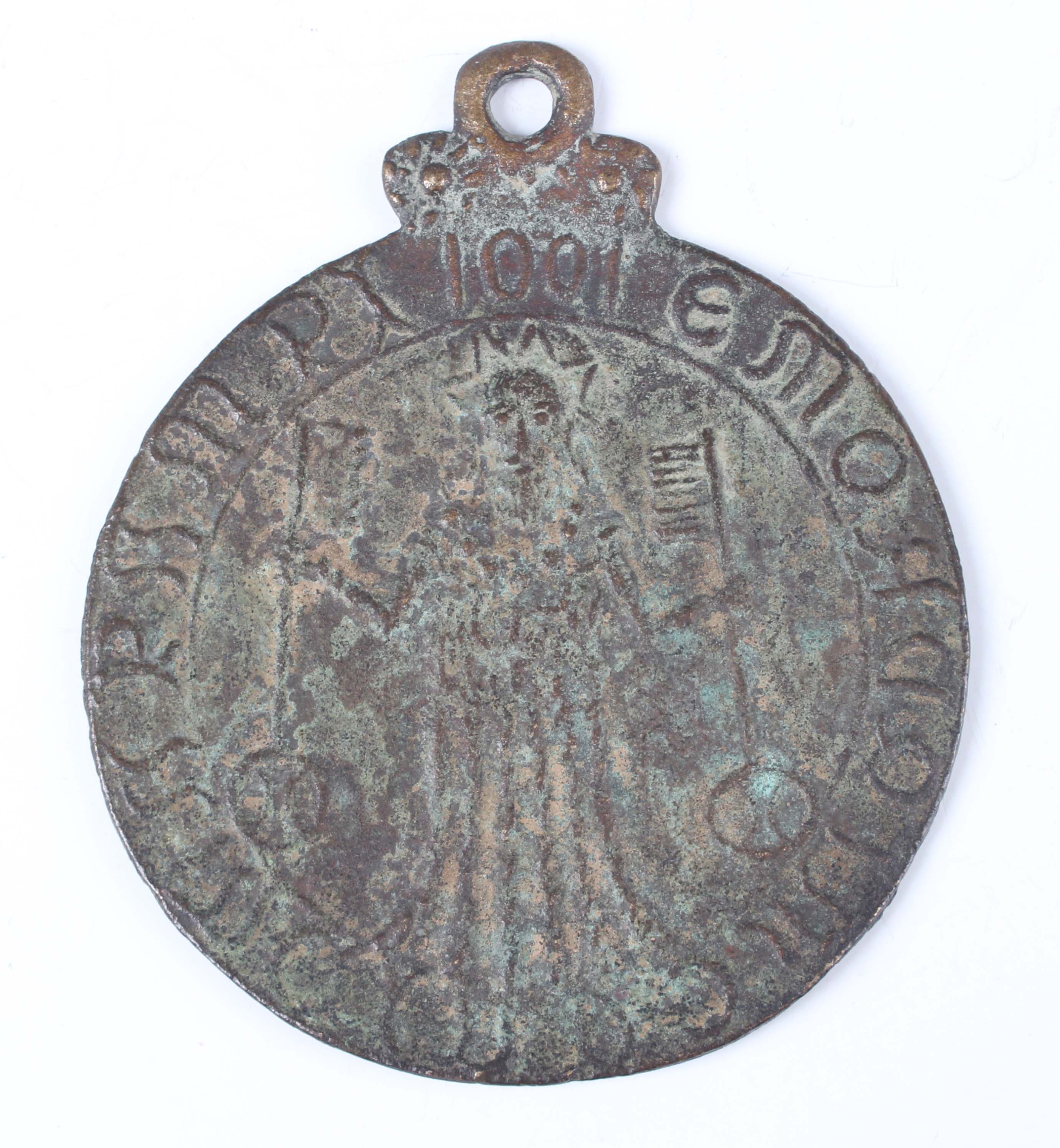 A 19th century copper-alloy 'Billy and Charley' Shadwell Dock forgery of a pilgrim's medallion, one side detailed with two knights in combat, the other with a religious figure holding two large keys, spuriously dated '1001', with borders of medieval style text. Note: William 'Billy' Smith and Charles 'Charley' Eaton produced and sold many notorious forgeries of medieval pilgrims' medals between 1857 and 1870.