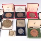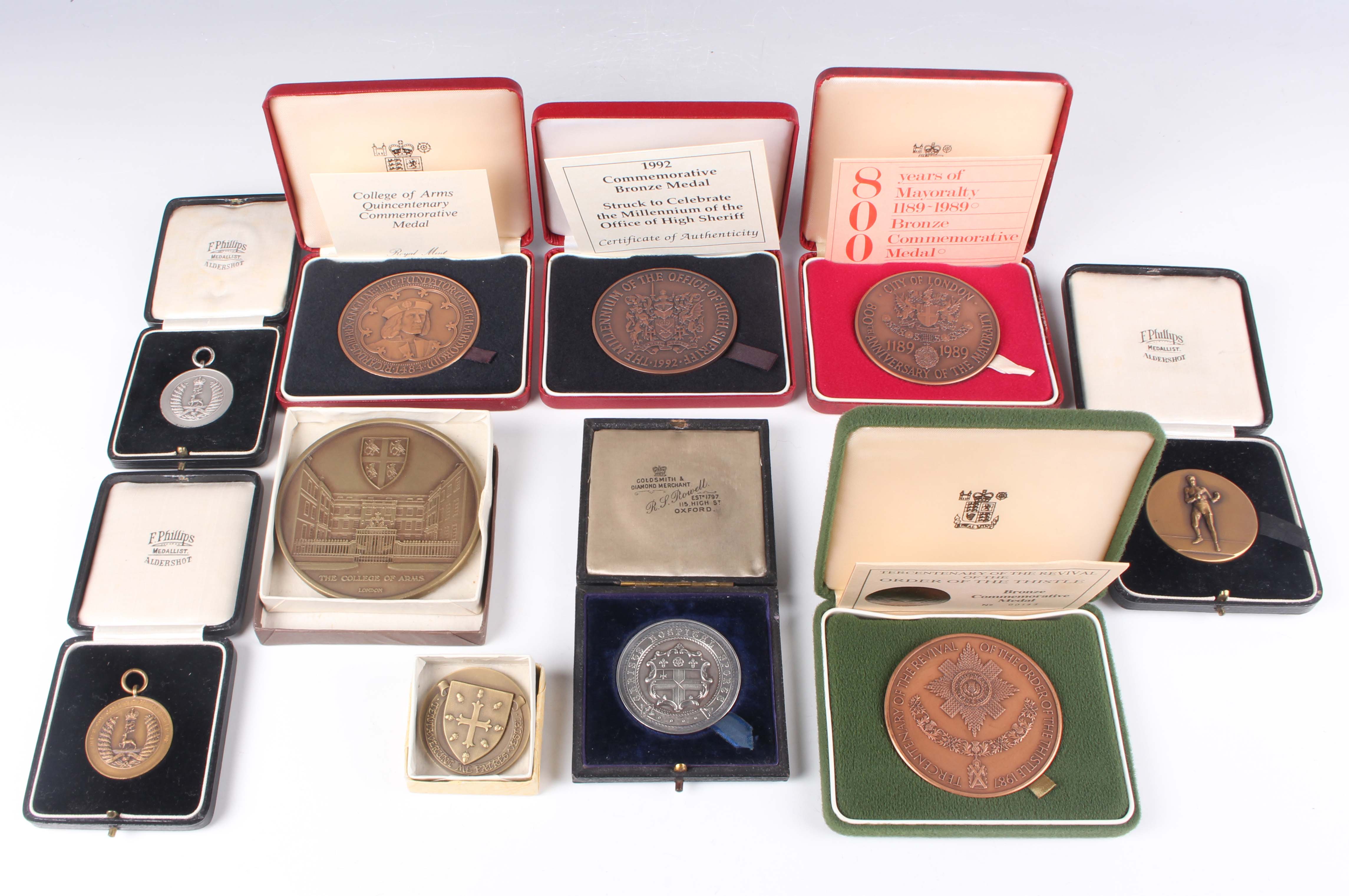 A small collection of medallions, including a silver plated Christ's Hospital Sports medal, awarded for 'Athletics 1910 ¼ Mile: CLII. 1st', cased, and a group of four Royal Mint bronze medallions, including one commemorating the Millennium of the Office of High Sheriff 1992, cased with certificate.