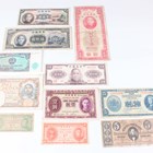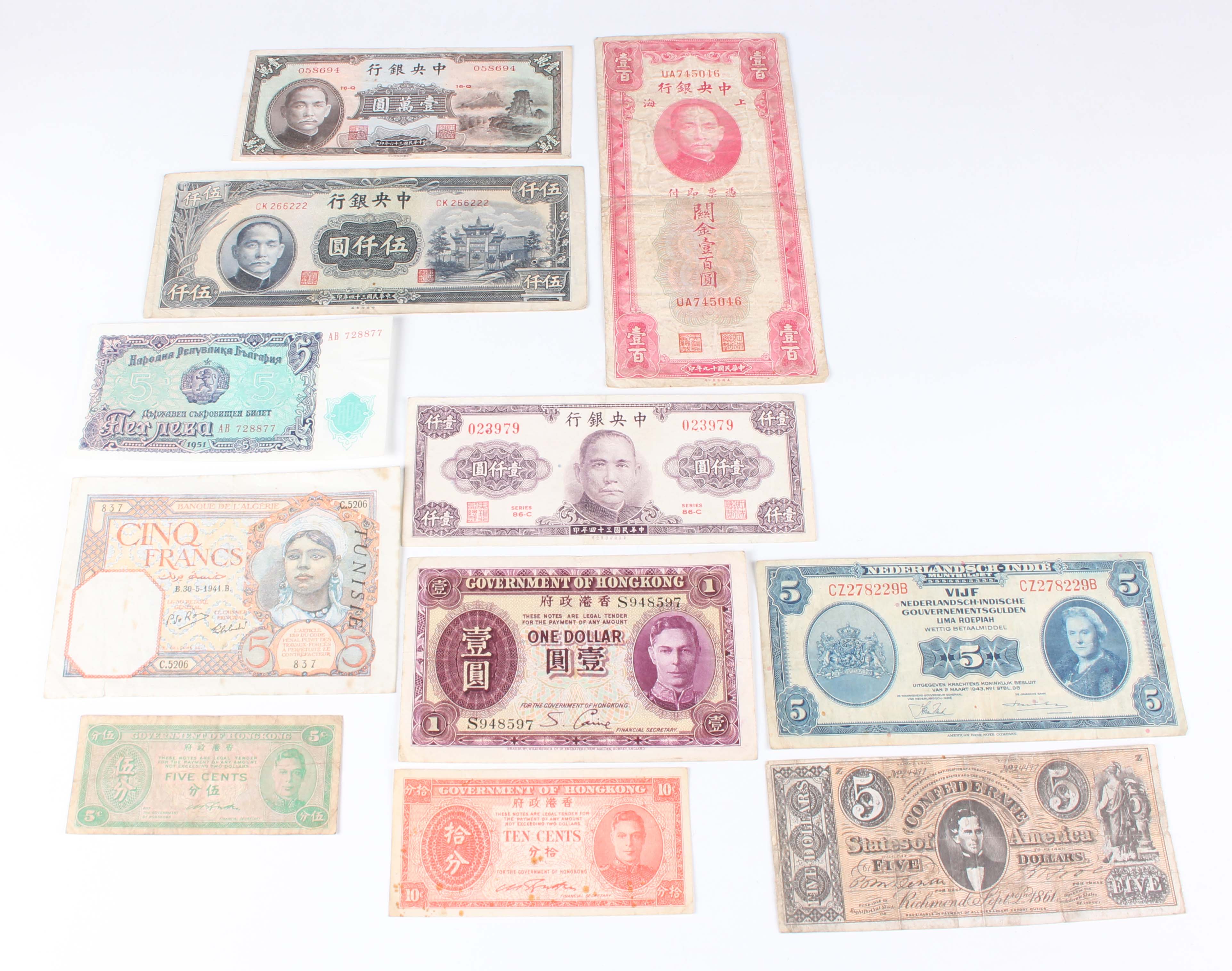 A small collection of mixed world banknotes, including a George VI Government of Hongkong one dollar note, serial number S948597, and a Central Bank of China one thousand yuan note, dated 1945.