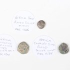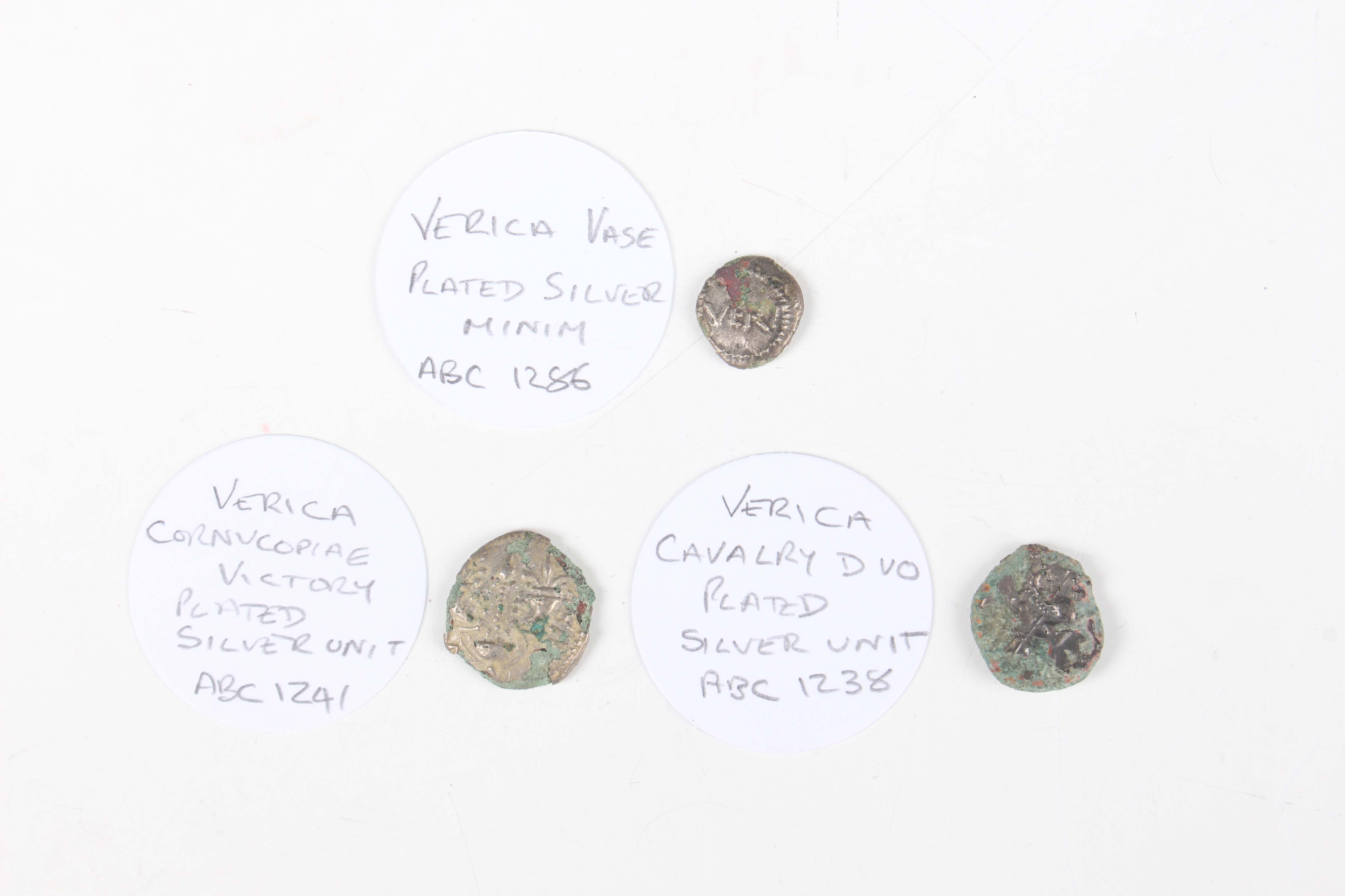 A group of three unusual Iron Age Verica Atrebates tribe silver-plated coins, comprising Cornucopiae Victory type unit, ABC 1241, Cavalry Duo type unit, ABC 1238, and Vase type minim, ABC 1286 (all with varying degrees of plating and details remaining).