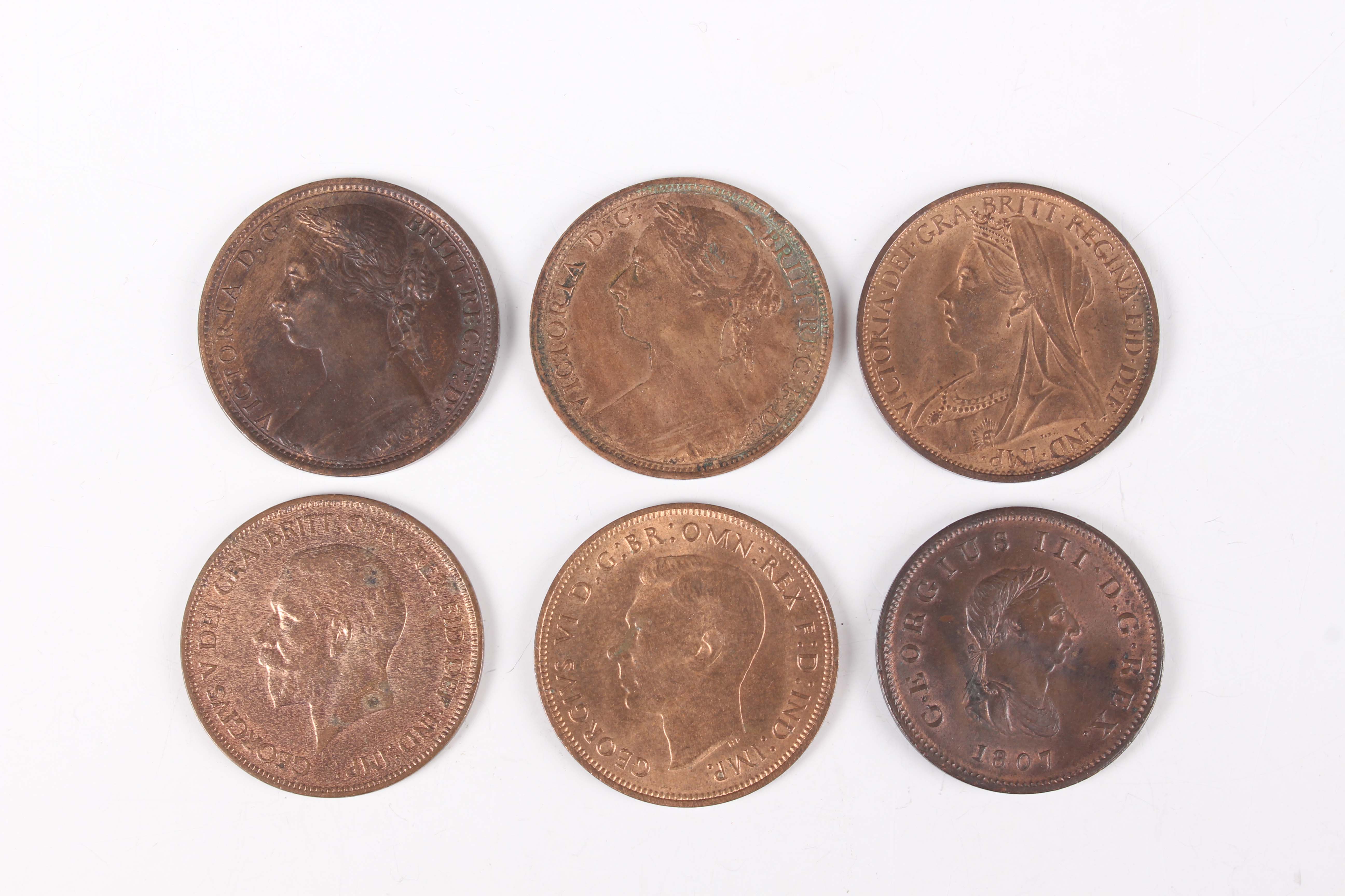A small group of George III and later pennies and halfpennies, including a George III halfpenny 1807 (uncirculated with some subdued lustre), a Victoria Young Head penny 1878 (extremely fine-uncirculated with some subdued lustre), and a George V penny 1928 (lustrous).