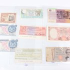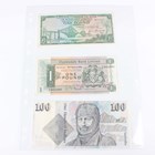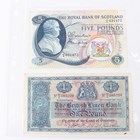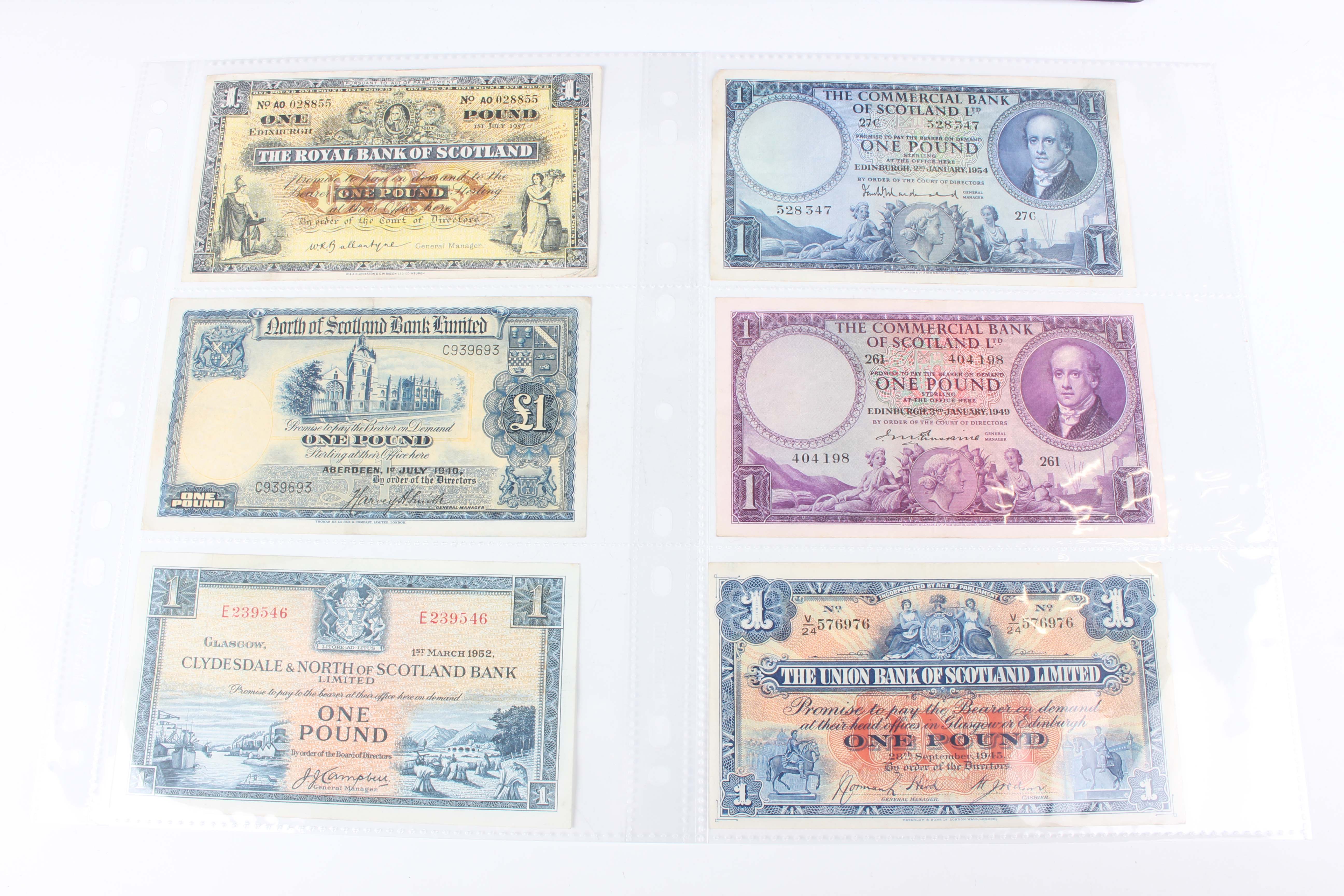 A collection of Scottish and other banknotes, including a Clydesdale & North of Scotland Bank Limited one pound note, Glasgow 1st March 1952, General Manager John James Campbell, serial number E239546, a North of Scotland Bank Limited one pound note, Aberdeen 1st July 1940, General Manager Harvey Smith, serial number C939693, a Royal Bank of Scotland one pound note, Edinburgh 1st July 1957, General Manager Robert Ballantyne, serial number AO 028855, and a Commercial Bank of Scotland Ltd one pound note, Edinburgh 3rd January 1949, General Manager Sir John Erskine.