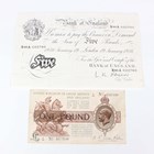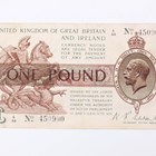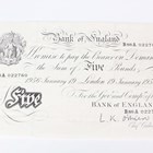 A Bank of England white five pounds note, London January 19th 1956, Chief Cashier L.K. O'Brien, serial number B88A 022760, together with a United Kingdom George V one pound note, Chief Cashier Norman Fenwick Warren Fisher, serial number 450900.