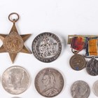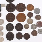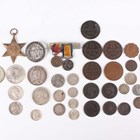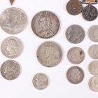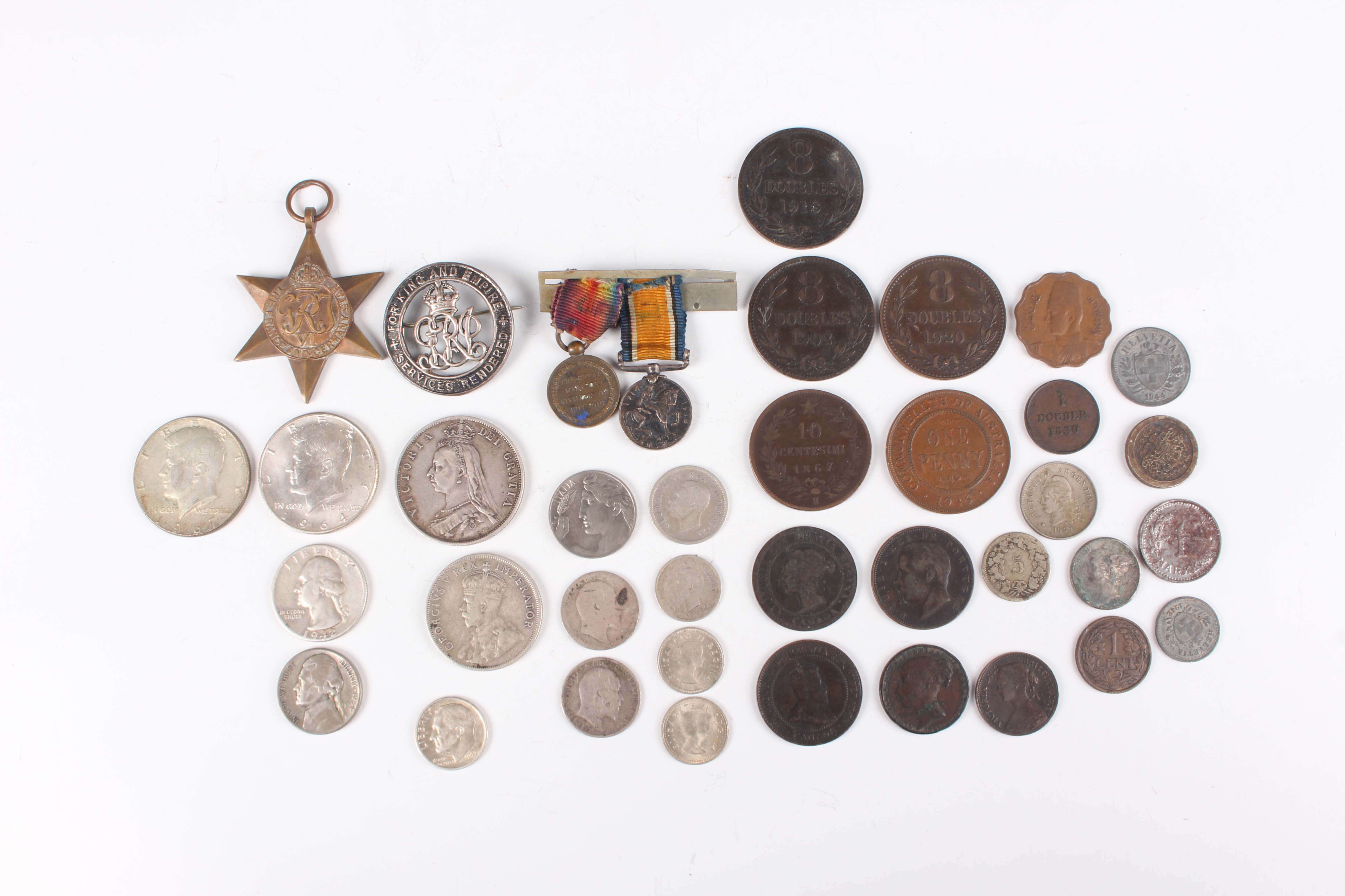 A small collection of European and world coins, medals and paranumismatic items, including a Victoria half-crown 1887, a USA Kennedy half-dollar 1964, a First World War period Services Rendered badge, numbered '278258', and a First World War miniature medal pair.