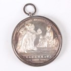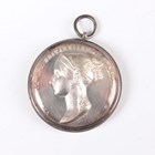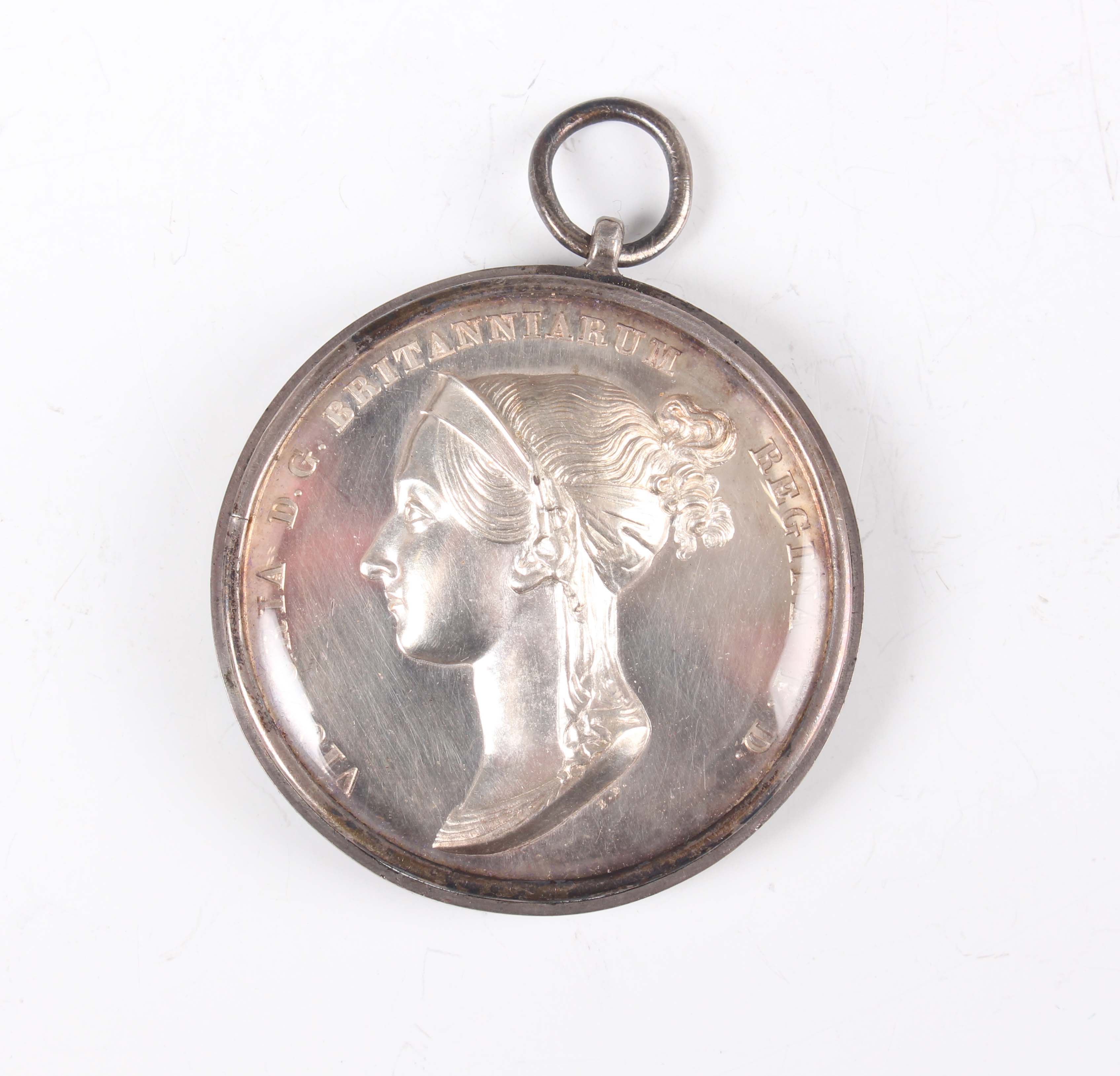 A Victoria silver coronation medal by B. Pistrucci, obverse with diademed bust facing left, reverse with Victoria enthroned, being offered the crown by Britannia, Scotia and Hibernia, Eimer 1315, mounted within a white metal cushion frame with glazed apertures, the rim engraved 'Presented by Her Majesty Queen Victoria to John Neill Esq S.H.C.', with an associated fitted box. Note: John Neill was very likely a chorister or performer at the ceremony.