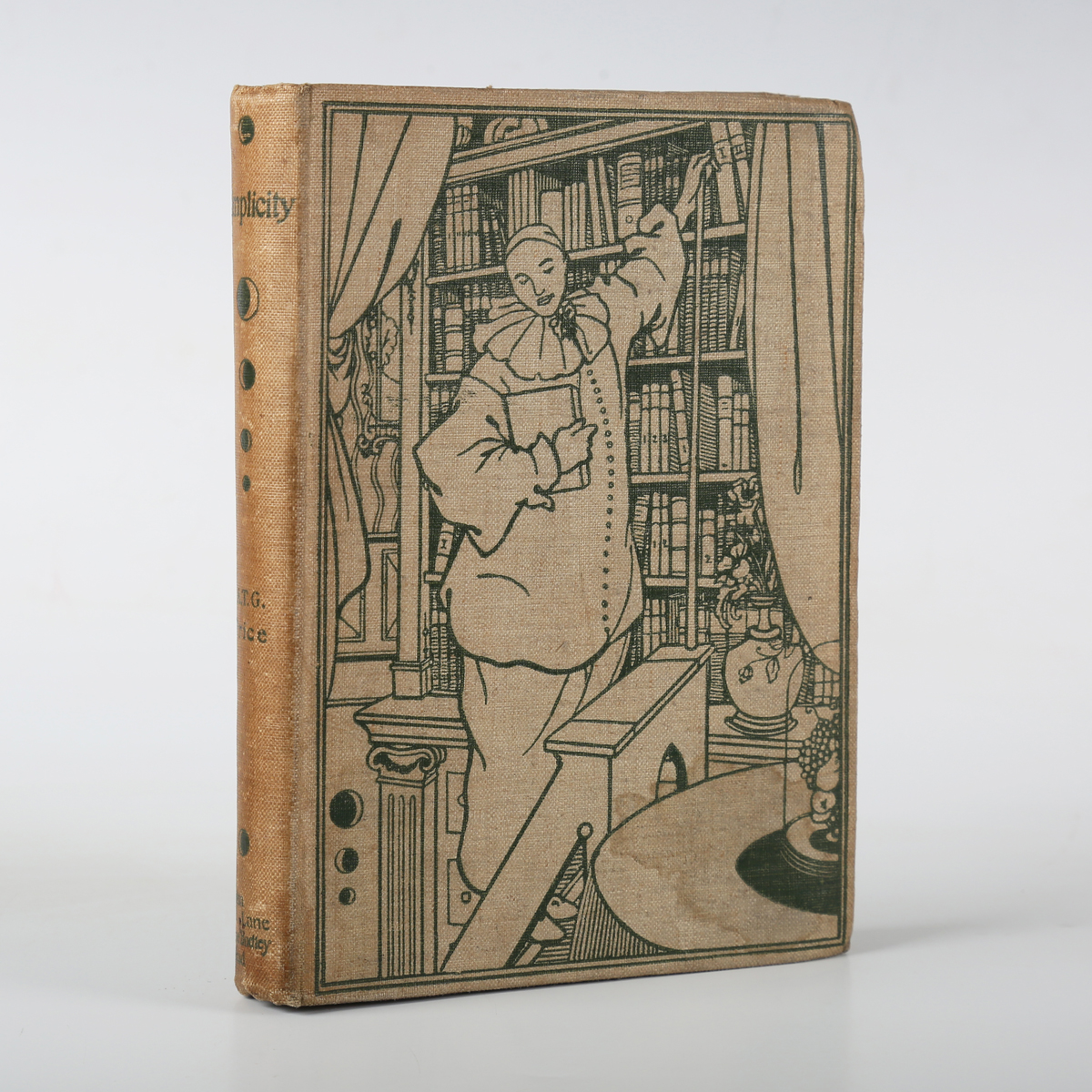 BEARDSLEY, Aubrey (illustrator). – A.T.G. PRICE. Simplicity. London: John Lane, The Bodley Head, 1896. First edition, 8vo (166 x 116mm.) Title, 16pp. publisher’s advertisements to rear, illustrated endpapers. (Toning, occasional mild spotting.) Original cloth illustrated by Beardsley (stain to upper cover, corner crease to rear endpaper). Note: this is volume 3 of the four volume Pierrot’s Library series issued by John Lane.