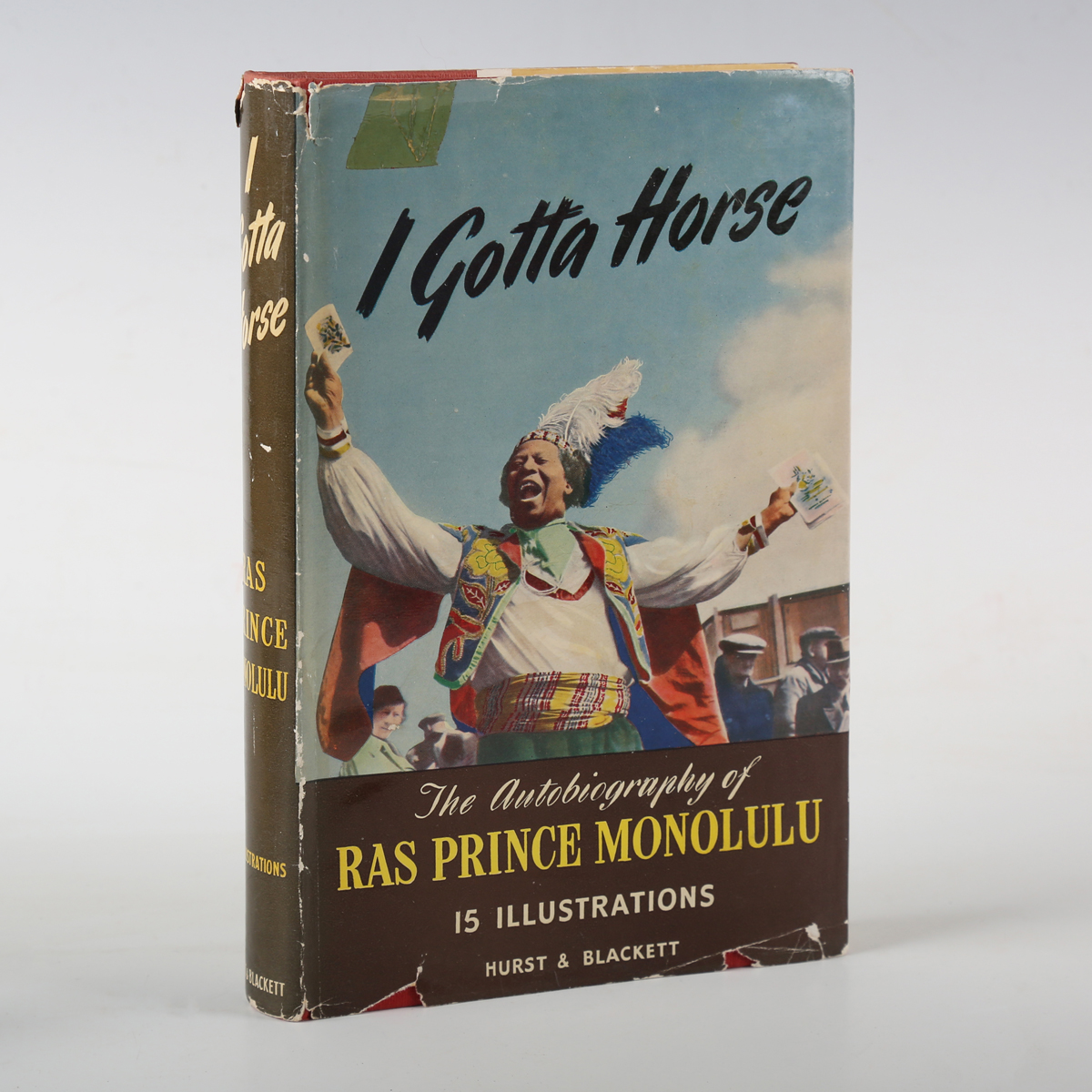 HORSE-RACING. – Ras Prince MONOLULU. I Gotta Horse… as told to Sidney H. White. London: Hurst & Blackett Ltd., [1950.] First edition, 8vo (212 x 133mm.) Photographic illustrations. (Toning.) Original red cloth (some staining to covers), dust-jacket (partially adhering to lower cover, chipping to extremities, old tape repairs at top of spine). Note: scarce. The autobiography of a black racing tipster who made his name in the 1920’s, wearing colourful headdresses and shouting ‘I gotta horse’.