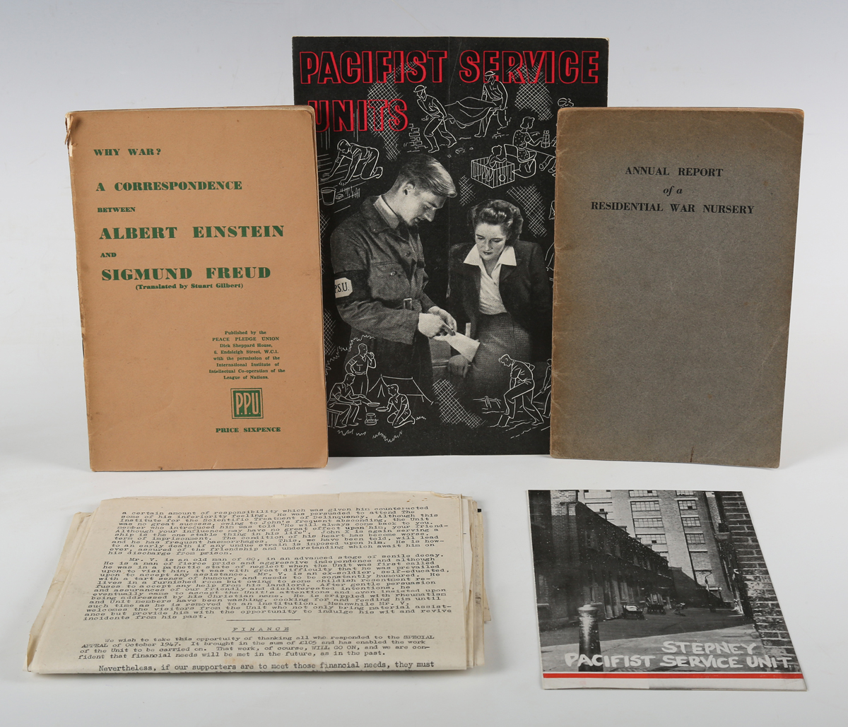 EINSTEIN, Albert and Sigmund FREUD. Why War? A Correspondence Between Albert Einstein and Sigmund Freud. Translated by Stuart Gilbert. [London:] Peace Pledge Union, April 1939. 8vo (214 x 139mm.) Original printed wrappers (some loss at top of spine). Note: first published in 1933 by ‘The International Institute of Intellectual Co-operation of the League of Nations’ as No. 2 in their series of ‘Open Letters’. With the threat of war looming, Einstein asks what psychological insight Freud’s discipline can bring to the threat of a war that would be incalculably more destructive than at any other time in history. Einstein’s own suggestion is to establish ‘a legislative and judicial body to settle every conflict arising between nations’ because the ruling classes of each nation have the means ‘to sway the emotions of the masses’. Freud suggests the best hope is to encourage the ‘eros’ impulse through cultural processes of ‘identification’. Failing that, we might instead learn to accept that war is ‘biologically sound and practically unavoidable’. And yet also, it might be asked, ‘if the community, in its turn, cannot claim a right over the individual lives of its members’. – And a further volume (‘Annual Report of a Residential War Nursery’ by Dorothy Burlingham and Anna Freud, 1942, 8vo, and several newsletters of the ‘Pacifist Service Unit’, 1943, 8vo) (2).