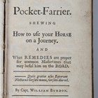 HORSES. – William BURDON. The Gentleman’s Pocket-Farrier. Shewing How to use your Horse on a Journey. And what Remedies are proper for common Misfortunes that may befall him on the Road. London: 1732. 12mo (165 x 98mm.) Title, 2pp. ‘Index’. (Light browning, lacking blank to rear.) Contemporary calf (rubbing and scuffing, joint splitting). Note: scarce. Provenance: J.B. Bingham (ink inscribed to front pastedown, dated 1820).
