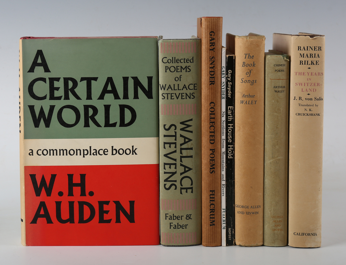 POETRY. – W.H. AUDEN. A Certain World. London: Faber and Faber, 1971. Second impression, 8vo (215 x 132mm.) (Mild toning.) Original red cloth, dust-jacket. – And a further seven volumes related to poetry (including ‘The Collected Poems of Wallace Stevens’, 1971, 8vo, and Gary Snyder’s ‘A Range of Poems’, second edition, signed by the author, 1967, 8vo, and Gary Snyder’s ‘Six Sections From Mountains and Rivers Without End’, signed by the author, 1967, 8vo) (8).