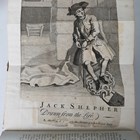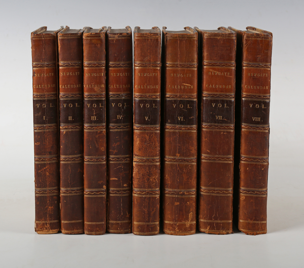 EXTRA-ILLUSTRATED. – William JACKSON. The New and Complete Newgate Calendar, or Malefactors’ Universal Register. London: Hogg and Co., [circa 1818.] 8 vols., 8vo (210 x 126mm.) 23 engraved plates and extra-illustrated with a further 71 engraved plates, some excised and mounted, several folding and 1 in colour. (Title of vol. 1 detached, occasional leaf loose, toning, intermittent spotting, tear to 1 plate, some chipping to margins.) Contemporary brown half calf over marbled paper-covered boards, two morocco lettering pieces to the spines (inner hinge of vol. 1 weakened, lightly rubbed). Note: many macabre illustrations showing various crimes and portraits of notorious criminals from 1700 onwards. Provenance: William Eden (armorial bookplates to front pastedowns) (8).