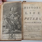 RUSSIA. – John MOTTLEY. The History of the Life of Peter I. Emperor of Russia. London: J. Read, 1740. 3 vols., second edition, 12mo (162 x 93mm.) 10 engraved plates, including 7 folding, engraved dedications, errata, indices. (Lacking maps, intermittent browning.) Contemporary calf (extremities rubbed, scuffing, minor loss to spine ends) (3).