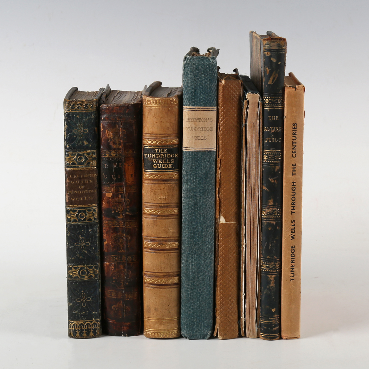 CLIFFORD, J. (compiler). The Tunbridge Wells Guide or an Account of the Ancient & Present State of that Place. Tunbridge Wells: J. Clifford, [1827.] Fourth edition, 12mo (170 x 101mm.) Folding map with outline hand-colouring, engraved title, 17 engraved plates, including 2 folding and 2 hand-coloured. (Toning, occasional spotting.) Near contemporary full black blind-stamped morocco with Greek-key gilt border, brown morocco lettering piece to the spine (lightly rubbed extremities). Note: extra-illustrated with 6 plates that are not listed: ‘The Parade’; ‘The Sussex Hotel’; ‘Trade Card of the Royal Kentish Hotel’; ‘Mount Ephraim’; and two hand-coloured views of ‘Eridge Castle’. Provenance: B.C.T. (bookplate to the front pastedown). – And a further seven guide books to Tunbridge Wells and Hastings (including [J. Clifford’s] ‘The Tunbridge Wells Guide’, 1808, and the 1801 edition, and the 1834 edition, and John Britton’s ‘Descriptive Sketches of Tunbridge Wells and the Calverley Estate’, 1832, 8vo, and ‘Thirty Views of Tunbridge Wells’, published by R. Pelton, [circa 1870], oblong 8vo, and [James Stell’s] ‘The Hastings Guide; or a Description of that Ancient Town and Port’, third edition, 1804, 8vo) (8).