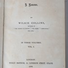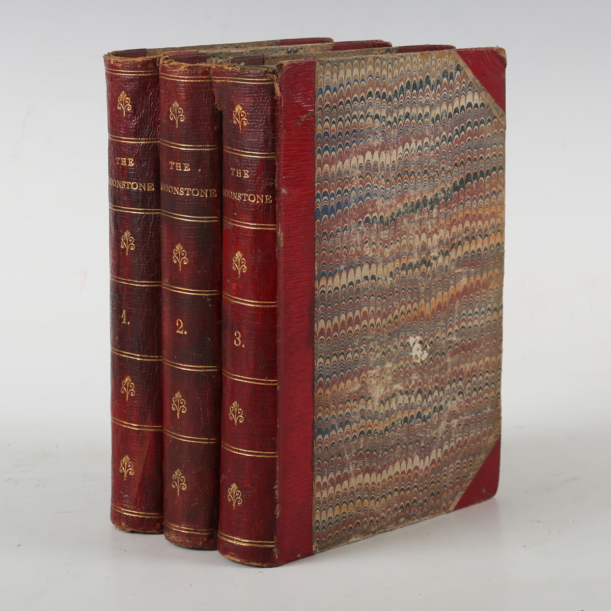 COLLINS, Wilkie. The Moonstone. A Romance. London: Tinsley Brothers, 1868. 3 vols. First edition, first state, 8vo (182 x 116mm.) Titles. (Lacking half-titles and advertisements, corner creases, occasional minor soiling, slight corner loss to pp.93-95 of vol. 2, small burn mark to p.211 of vol. 2.) Contemporary red half morocco over marbled paper-covered boards (extremities rubbed, lower joint splitting at top of vol. 3, text-block slightly shaken to vol. 1 and with upper hinge weakened). Note: all volumes in the first state. Volume 1 with pp.10 and 11 numbering transposed, volume 2 with ‘treachesrously’ on p.129, and volume 3 with the broken bracket at end of title. Considered one of the forerunners of the modern detective novel. [Sadleir 598; Wolff 1368] (3).