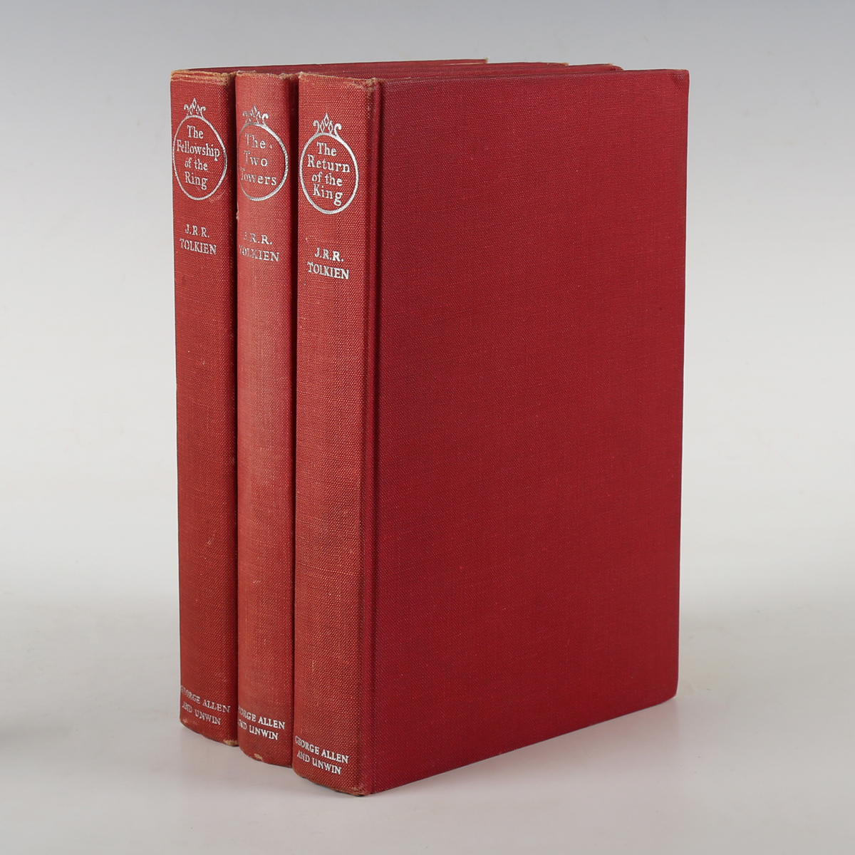 TOLKIEN, J.R.R. The Lord of the Rings. London: George Allen & Unwin Ltd., 1965. 3 vols., mixed impressions, 8vo (202 x 138mm.) 3 folding maps. (Mild toning.) Original red cloth (lightly rubbed extremities, minor marks to lower covers). Note: ‘The Fellowship of the Ring’ is a fourteenth impression, ‘The Two Towers’ and ‘The Return of the Ring’ are both eleventh impressions (3).