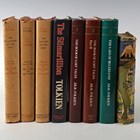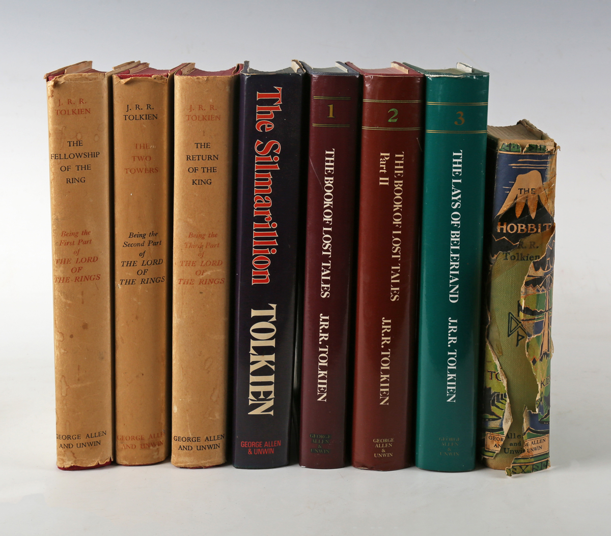 TOLKIEN, J.R.R. The Lord of the Rings. London: George Allen & Unwin, 1965-1966. 3 vols., mixed impressions, 8vo (222 x 142mm.) 3 folding maps. (Crease to rear endpaper of ‘The Return,’ toning, spotting to fore-edges.) Original red cloth (spotting to upper covers of ‘The Return’ and ‘The Two Towers’), dust-jackets (spines browned, minor chipping, occasional finger-mark). Note: ‘The Fellowship of the Ring’ is the 15th impression, ‘The Two Towers’ is the 11th impression in a 12th impression dust-jacket, ‘The Return of the King’ is an 11th impression. – And a further five volumes by J.R.R. Tolkien (‘The Book of Lost Tales’, Part 1, 4th impression, 1984, 8vo, and ‘The Book of Lost Tales’, Part 2, 1st impression, 1984, 8vo, and ‘The Lays of Beleriand’, 1st impression, 1985, 8vo, and ‘The Silmarillion’, 1st impression, 1977, 8vo, and ‘The Hobbit’, 14th impression, 1963, 8vo) (8).