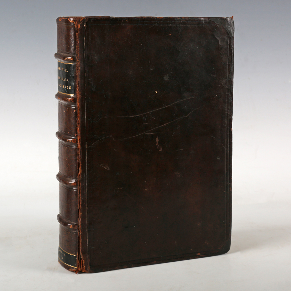 WEEVER, John. Ancient Funeral Monuments within the United Monarchie of Great Britain, Ireland, and the Islands adjacent, with the dissolved Monasteries therein contained. London: Thomas Harper, 1631. First edition, small folio (284 x 189mm.) Eighteen woodcut illustrations to the text. (Lacking the frontispiece and additional engraved title, marginal damp-staining to several leaves, lacking index.) Contemporary calf, later black morocco lettering piece to spine (endpapers replaced, a few scuff marks, light rubbing). Note: John Weever was an English antiquary and poet and he took an interest in tomb inscriptions from his first publication in 1599. He then spent thirty years collecting tomb inscriptions across England, Scotland, Ireland, France and Italy.