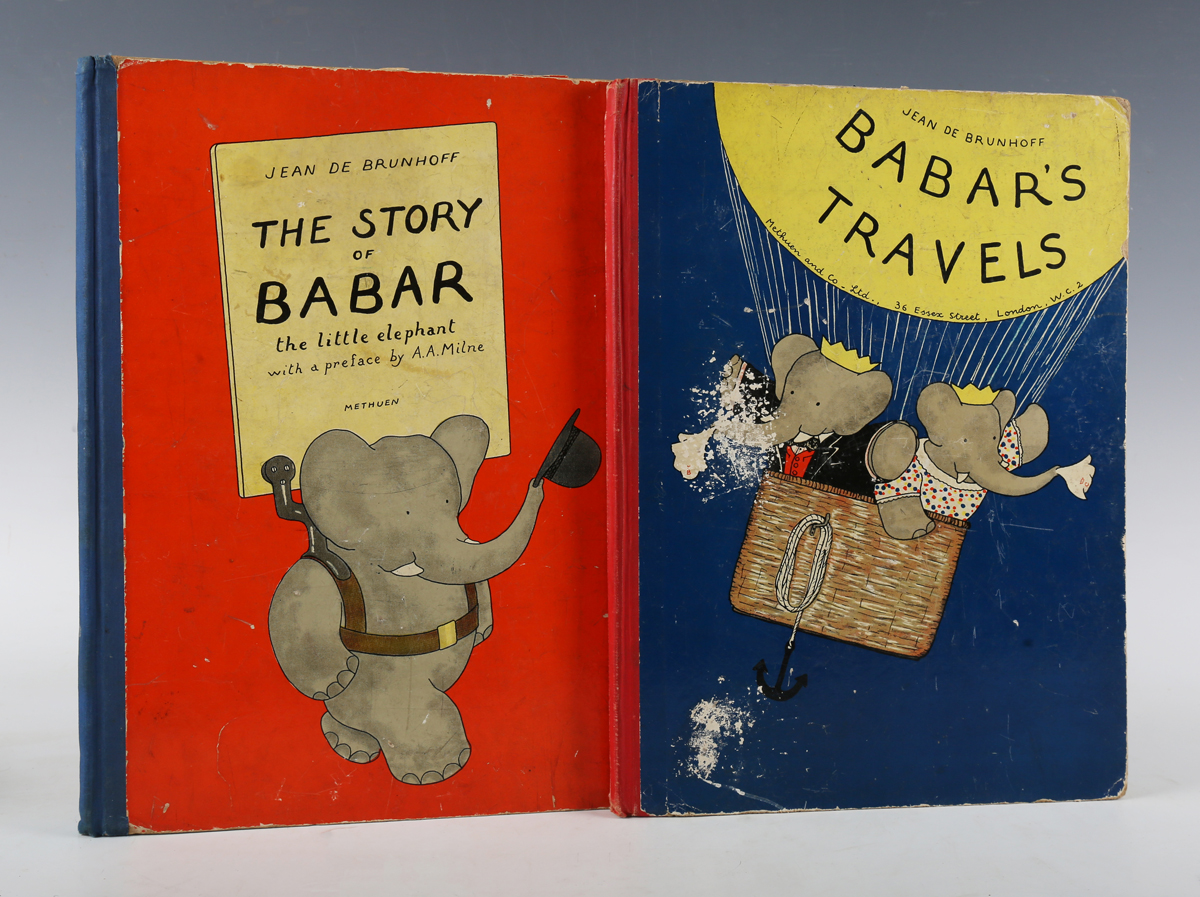 CHILDREN’S BOOKS. – Jean de BRUNOFF. The Story of Babar, the Little Elephant. London: Methuen & Co. Ltd., 1934. First U.K edition, folio (358 x 257mm.) Preface by A.A. Milne, colour illustrations. (Toning, marginal scribbling to two leaves.) Original blue cloth-backed pictorial boards (hinges weakened, extremities rubbed, scuffing). Provenance: Margaret Buckle (pencil name and address to title). – And a further volume (Jean de Brunhoff’s ‘Babar’s Travels’, second U.K edition, 1936, folio) (2).