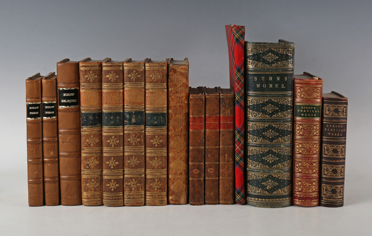BURNS, Robert. Poems, Chiefly in the Scottish Dialect. Edinburgh: T. Cadell and William Creech, 1794. 2 vols., new edition, 12mo (185 x 109mm.) Engraved portrait frontispiece. (Spotting to title of vol. 1, light to moderate spotting thereafter, occasional crease, blanks replaced.) 20th century brown half morocco over marbled paper-covered boards, black morocco lettering pieces to spines (endpapers replaced). Provenance: George Giddins (ink name to titles). – And a further thirteen volumes (including ‘Reliques of Robert Burns’, 1808, 8vo, and James Boswell’s ‘The Life of Samuel Johnson’, 4 vols., 1807, 8vo) (15).