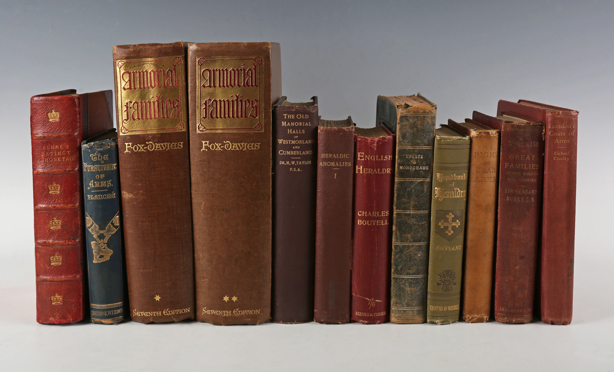 HERALDRY. – John BURKE and John Bernard BURKE. A Genealogical and Heraldic History of the Extinct and Dormant Baronetcies of England. London: Scott Webster and Greary, 1844. Second edition, 8vo (228 x 142mm.) Portrait frontispiece, tissue-guard, chromo-illuminated title, crest illustrations to text. (Toning, pencil marks to margins.) Contemporary red half morocco (some fading). Provenance: Theobold Blake Butler (armorial bookplate to front pastedown); Vincent Powell-Smith (armorial bookplate to front-free endpaper); Barry Maclean-Eltham (armorial bookplate verso front-free endpaper). – And a further eleven volumes related to heraldry (including J.R. Planché ‘The Pursuivant of Arms’, [1887], 8vo, and Arthur Charles Fox-Davies’ ‘Armorial Families, a Directory of Gentlemen of Coat-Armour’, 2 vols., 1929-1930, 4to) (12).
