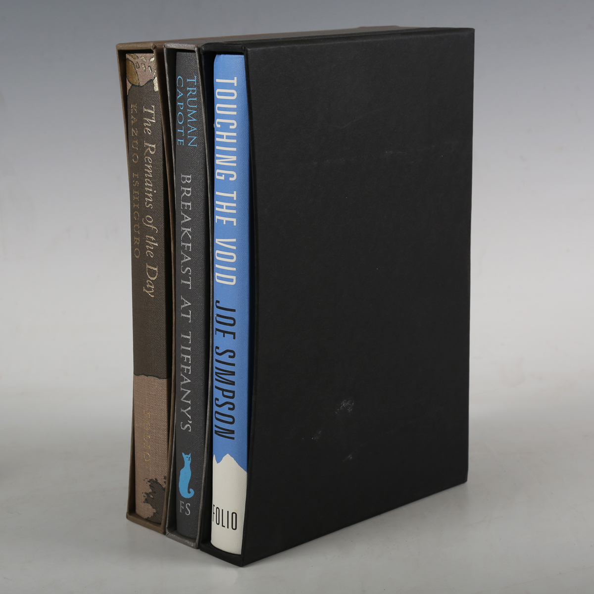 FOLIO SOCIETY (publisher). – Kazuo ISHIGURO. The Remains of the Day. London: The Folio Society, 2009. 8vo (222 x 152mm.) Illustrations by Finn Campbell-Notman. Original pictorial cloth, slipcase. – And a further two volumes published by The Folio Society (Truman Capote’s ‘Breakfast at Tiffany’s’, 2013, 8vo, and Joe Simpson’s ‘Touching the Void’, 2008, 8vo) (3).